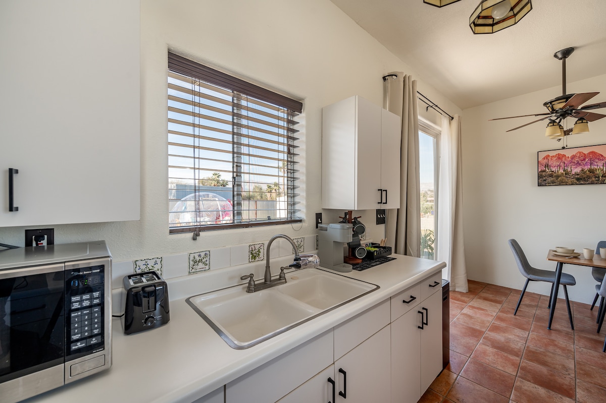 「Sphere In The Rocks」沙漠度假勝地,配有牛仔泳池、按摩浴缸、火坑、日光床、餐廳和燒烤! ★「一個鼓勵連結、反思和存在的神奇空間。」❤️ ✔️建築聲音療癒球 ✔️推薦→禮賓主廚和聲音浴(請向我們詢問!) ✔️設備齊全+備有食材的廚房 ✔️反滲透濾水器 ✔️停車位→車道(4輛車) ✔️50 Mbps WiFi +工作區 ✔️室外淋浴間+浴缸+火 3分鐘→約書亞樹國家公園入口 10分鐘→約書亞樹市中心