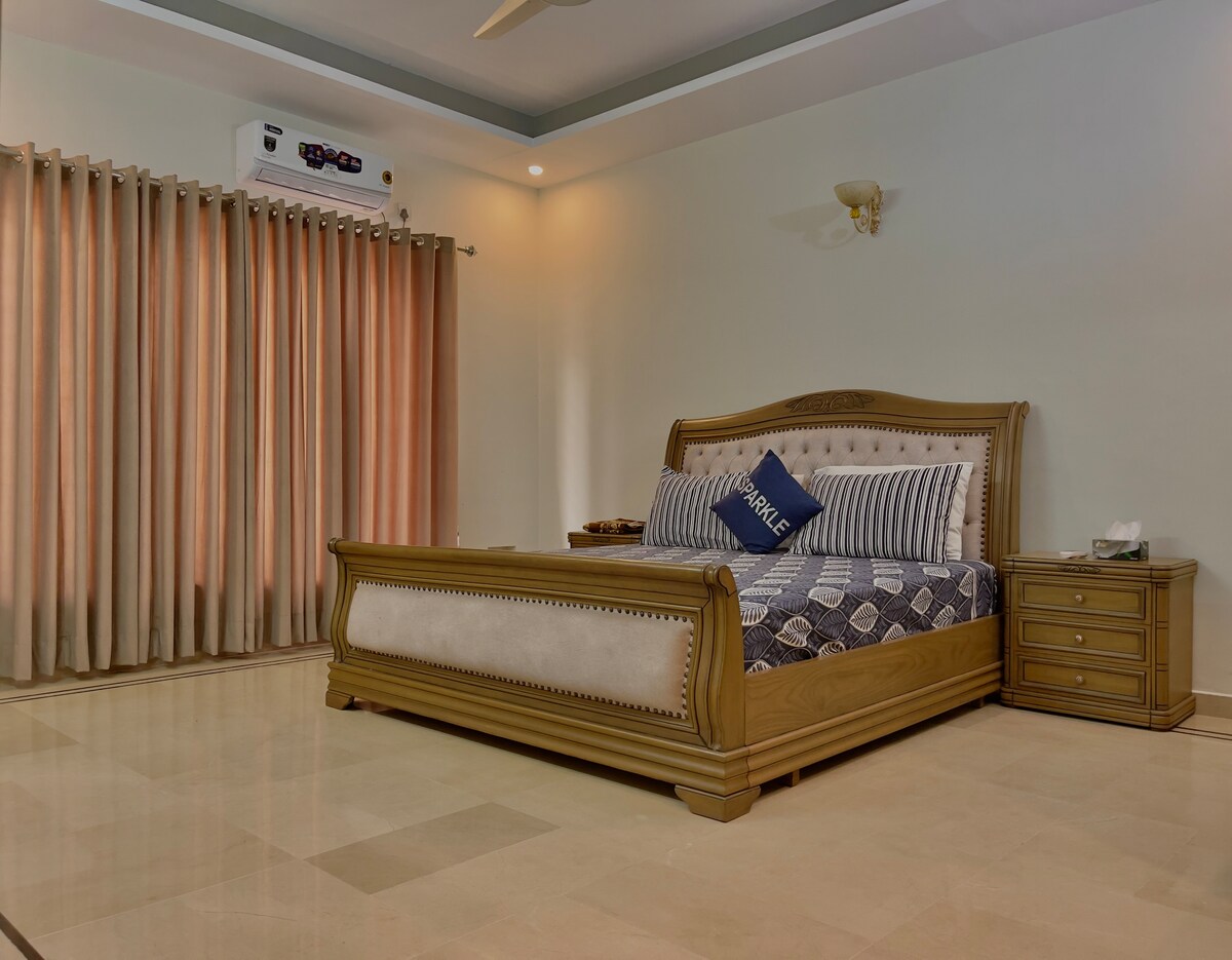Modern 3BR upper portion in Bahria Town Phase 8, designed like a boutique hotel. Feels like home away from home with a modern touch & 5 ⭐️ hotel comfort. 🛌 Each bedroom has a king bed, private modern bathroom, inverter AC, 55” Smart TV with Netflix & other streaming apps. 💠 Enjoy high-speed Wi-Fi, complimentary breakfast on request, fully equipped kitchen, on-site laundry & 24/7 hot water. Safe, gated community with CCTV, electric fencing on exterior, 24/7 on-site helper and free parking.
