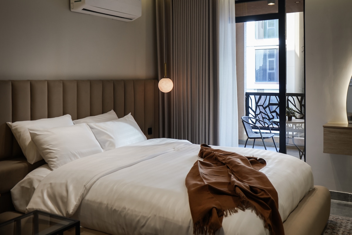 在胡拜爾市中心的高檔奧拉亞區,享受獨特的居住體驗,靠近胡拜爾的所有地標(購物中心 - 阿美石油公司 - 伊特拉 - 體育俱樂部 - 餐廳 - 咖啡館)。套房包括一間臥室和一個帶浴室的大廳,臥室配有一張舒適的床,可讓您睡得香甜安靜;大廳配有一張一體式咖啡桌、一台 75 英寸三星 4K QLED 電視和一個一體式浴室。簡而言之,美麗的住宿體驗