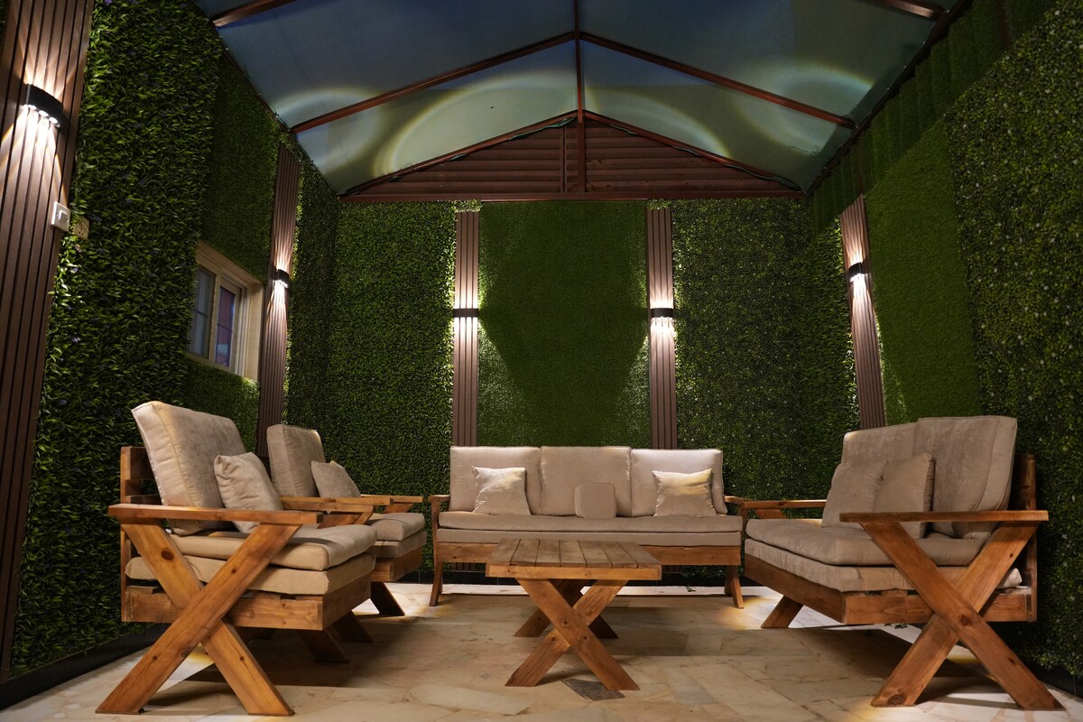 استمتع معنا بتجربة جديدة وفريدة من نوعها تنقلك إلى بعد آخر من عالم الضيافة التشاركية !... مرحباً بك في عقارنا المبتكر وهو عبارة عن استوديو جميل وواسع يحتوي على مطبخ متكامل وجلسة داخلية تتسع لـ 5 اشخاص وسرير مقاس كوين (عرض 160cm) يتسع لشخصين ، جلسة خارجية تتسع لـ 4 اشخاص وركن صغير للشواء.