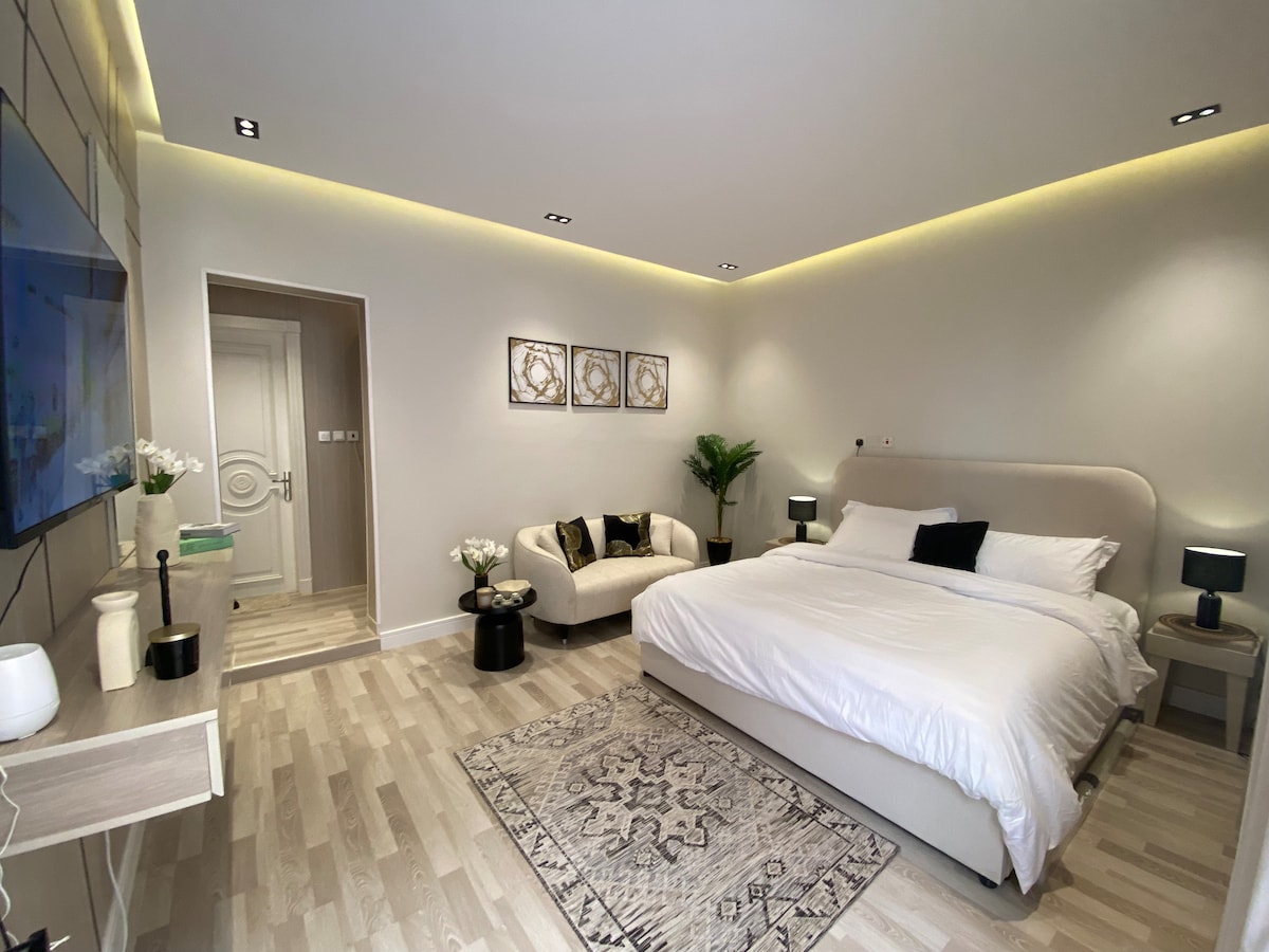 Live in style at this boho-chic 1BR suite in Dhahrat Laban! Ground floor with private vibe, cozy lighting, designer furniture, fast Wi-Fi, smart TV, and a full kitchen. Perfect for professionals or couples wanting a warm, relaxing stay near KSU and key city spots. A boutique hotel feel—without the price tag.