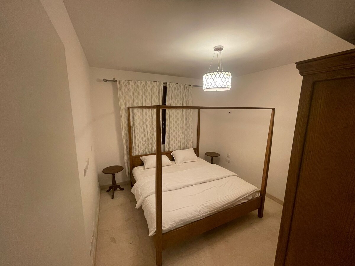 Discover relaxation in our serene Scandinavian-style apartment at Hawana Salalah Resort. The spacious bedroom and living room with convertible sofa ensure comfort. Enjoy the fully equipped kitchen and the stunning view from the spacious balcony overlooking the river and mountains. Benefit from free parking, cleanliness, and nearby amenities like a giant swimming pool and sports courts. With two hotel resorts close by, your stay promises a memorable family retreat.