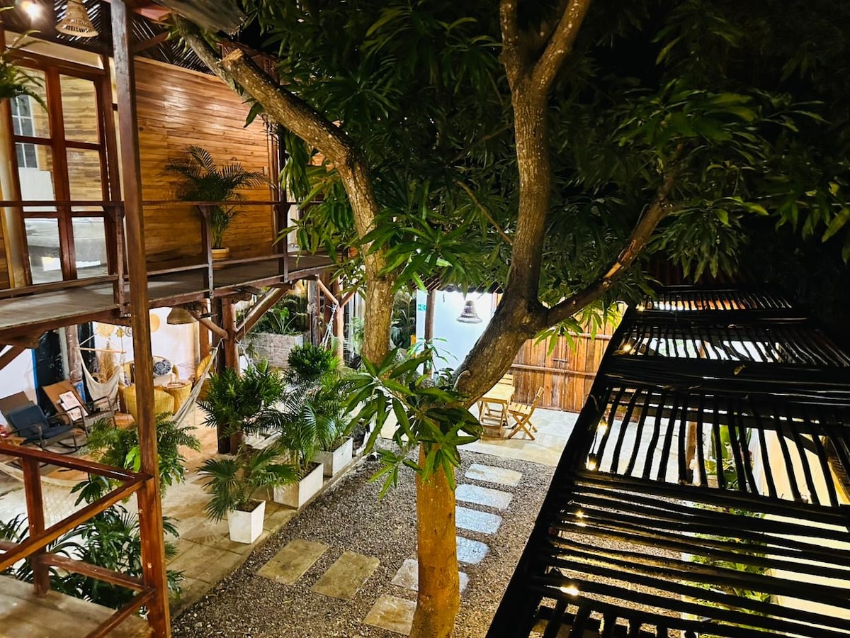 我們的樹屋位於Playa la Ola ,距離大海幾公尺,步行5分鐘即可抵達Casa Chapolin接待處。 這是一間兩層平房,樓上是配有雙人牀、獨立浴室和露臺的房間,一樓有花園、吊牀空間和沙發、室外開放式淋浴間。 非常適合一兩人入住,靠近酒吧和餐廳,並享有自己的隱私。