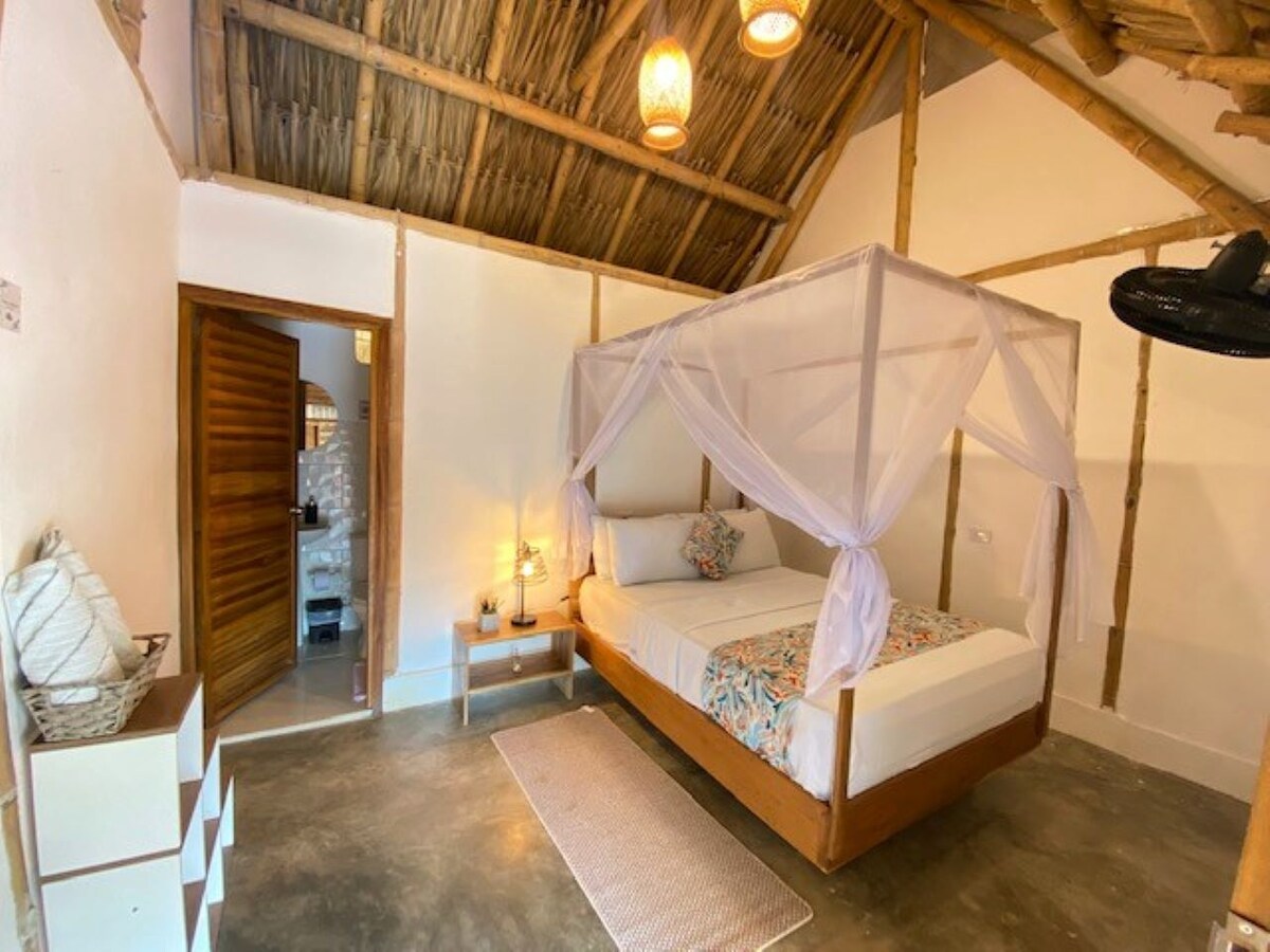 Ideal para parejas y celebraciones románticas, ofrece el máximo confort y privacidad. 1 cama King, Jacuzzi, terraza privada, Ventilador de techo, mosquiteros, Baño privado con doble ducha a cielo abierto, hamacas y vistas al mar. WiFi, agua potable fría.