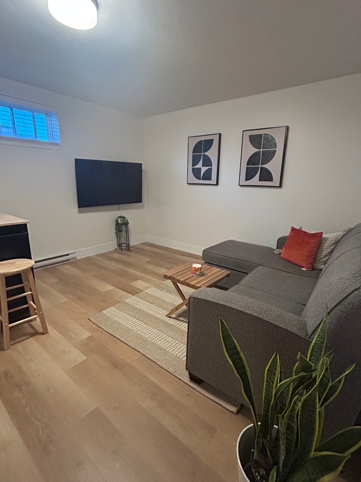 This stylish 1-bedroom basement apartment accommodates up to 4 adults. The space is completely separate and independent from the house upstairs. -The apartment includes a bedroom with a queen-size bed and a pull-out sofa in the living room for additional guests. - Full bathroom -Fully equipped kitchen -Laundry room with washer & dryer -50" Smart TV with Netflix (no cable) -Separate entrance with secure keypad/code access. -Free parking for up to 2 cars. -Located in a very safe neighbourhood.