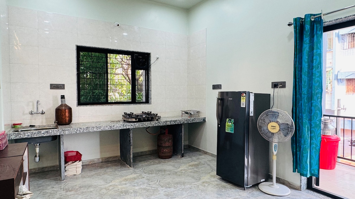 舒適的2BHK,四周綠意盎然,距離寧靜的海灘僅900公尺。 空調房+大廳,可容納10位房客。 享受露台觀星、鳥鳴晨歌和寧靜夜晚。探索芒果果園、附近的山丘,或閱讀一本書放鬆身心。 設備齊全的廚房、寵物友善的門禁空間、開放式座位。 內部廚師提供美味的海鮮。非常適合尋求寧靜、舒適和海岸魅力的家庭和自然愛好者。