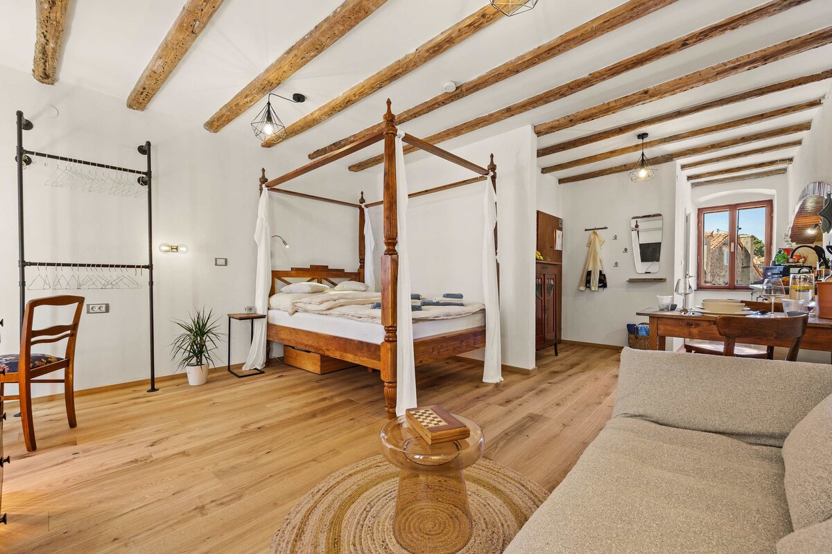 在我們位於波雷奇市中心的迷人一房公寓中,探索寧靜。沉浸在郁郁葱葱的花園中,欣賞鮮艷的花朵和橄欖樹,同時享受市中心的便利,步行5分鐘即可抵達海灘。您的住宿配備所有現代舒適設施,我們甚至提供兩輛自行車,讓您輕鬆探索周圍地區。歡迎來到您的完美度假勝地!