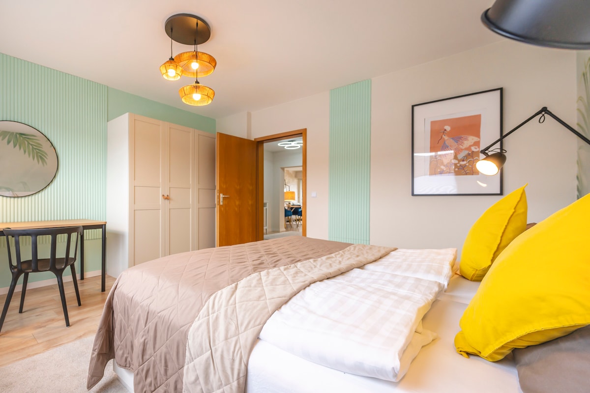 這間位於市中心的現代化 3 房公寓可容納團體或家庭,並有 6 張單人床。 明亮、時尚的空間能營造愉悅的氛圍。 設備齊全的廚房和維護良好的浴室,配備淋浴間,確保舒適。 客廳有大電視和舒適的工作空間。 此外,還有一個陽臺,您可以在那裡放鬆身心。 自助入住以及酒店品質的床和寢具。