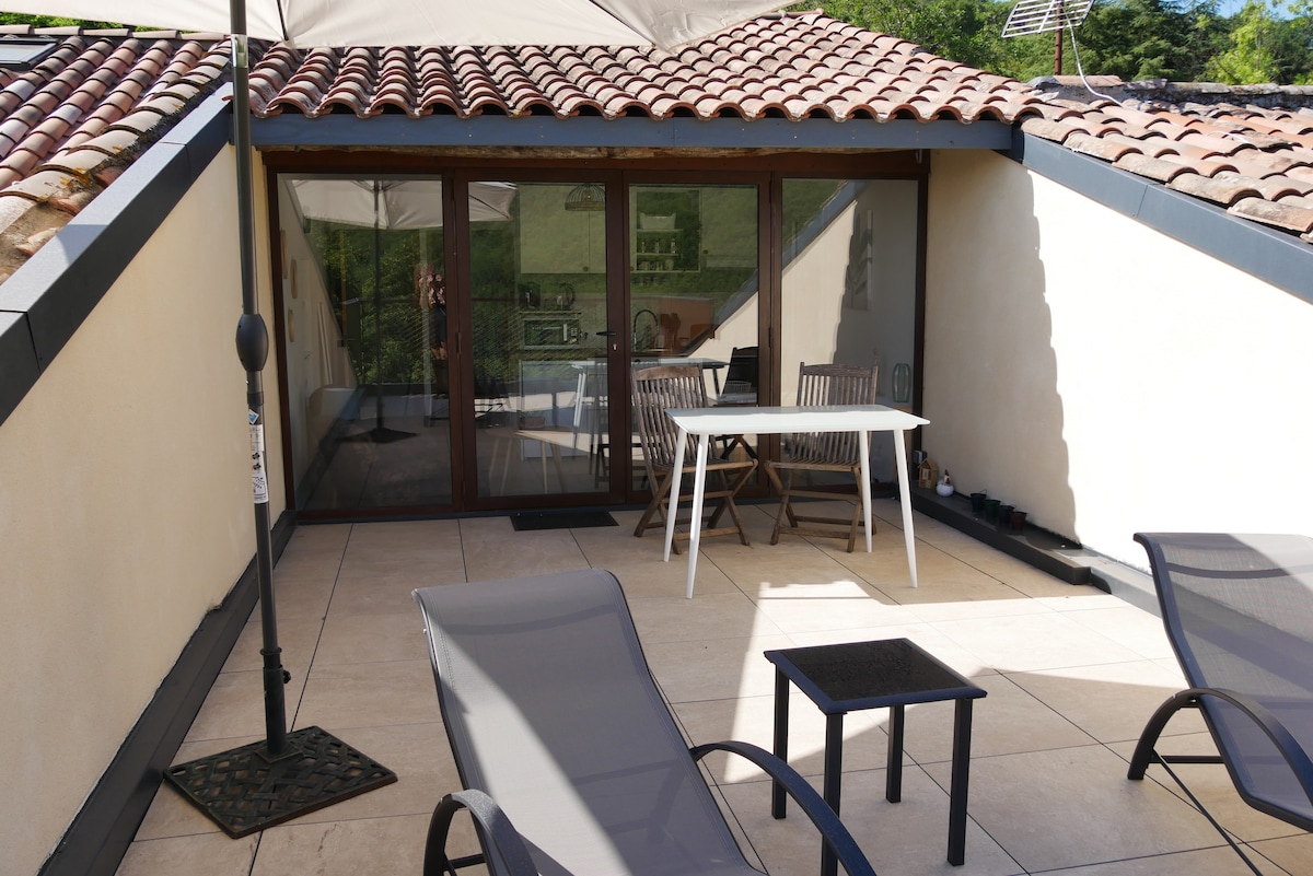 在這個獨特而寧靜的地方放鬆身心。 在前往2個湖泊的途中,靠近Chemin de St Jacques de Compostelle ,您可以在裝潢精美的公寓中停留,配有Tropezian露臺和令人驚嘆的山谷景觀。 該公寓位於一樓,可通過安靜村莊的樓梯進入。