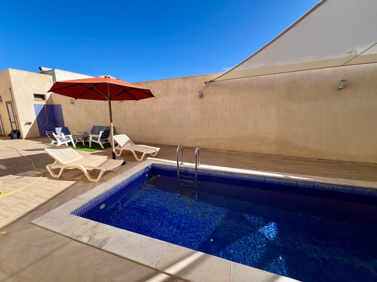 AYOUB 別墅 房子位於 Midoun 的 Tazdaine,包括: - 4 間主臥室套房,其中 3 間位於樓上,1 間位於一樓。 - 非常棒的雙人客廳和餐廳。 - 現代化廚房,可俯瞰美式客廳和餐廳。 - 4 間浴室。 - 5 間浴室。 - 可種植物的草坪花園。 - 戶外飯廳。 -烤肉。 - 配有瀑布的無邊際泳池 9/4 無對面景觀。 - 警報系統和全天候監控錄影機。 -上網。
