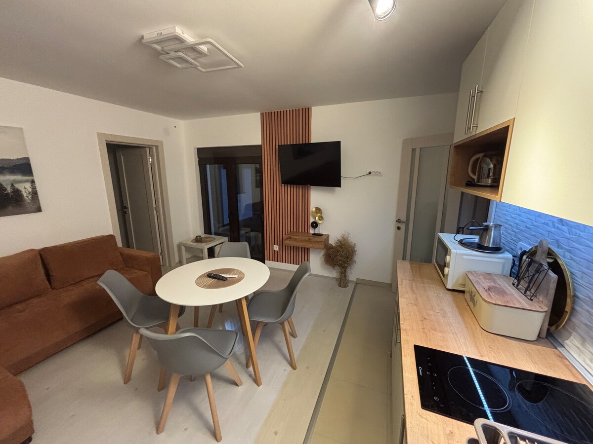茲拉蒂博爾區域是山區天堂。當您在高大的松樹之間巡遊時,您會立即感到放鬆。當您進入我們的全新公寓時,您會有那種「家的感覺」。這間全新的單臥室公寓設備齊全,包括壁爐。躺在高級床墊上,讓您睡得像嬰兒一樣。大樓是一棟安全的建築,前面有免費停車位。再完成幾個步驟就能抵達市中心和所有活動