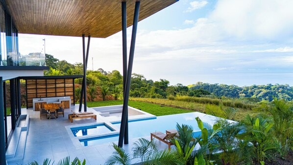 Welcome to your private tropical retreat including a Free Private Chef included in your stay — a designer 5-bedroom, 5-bath (with extra family Room / Bedroom with Sofa Bed) luxury villa crafted for families, groups, retreats, and unforgettable Costa Rica getaways. Perched in the lush hills with sweeping jungle and ocean breezes, this home blends modern comfort with natural beauty and high-end finishes throughout.