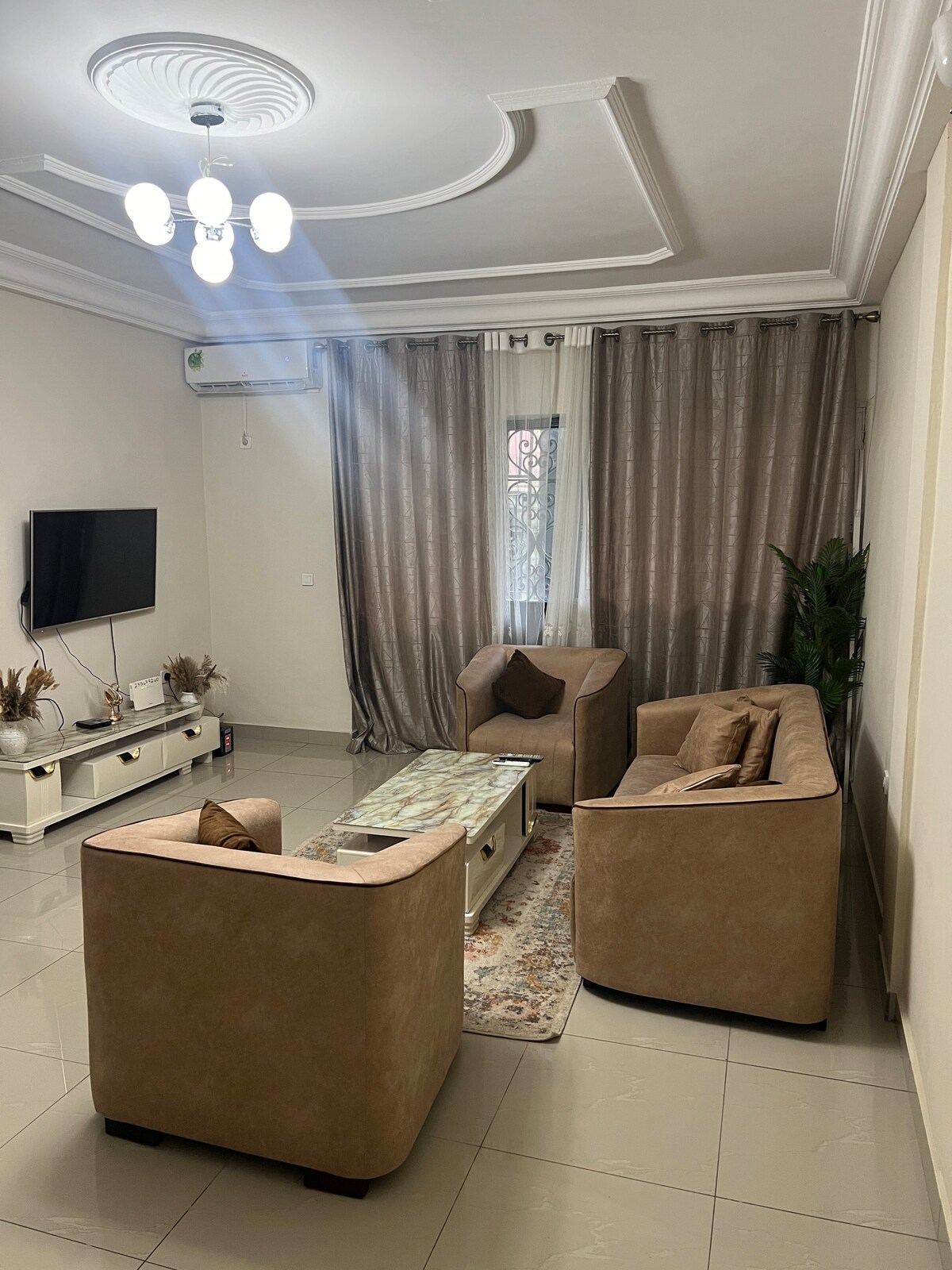 L'appartement en question dispose de plusieurs équipements confortable pour mettre à l'aise le client qui y sejournera à savoir les meubles confortable avec wifi , balcon , , chambre spacieuses suivie de la salle de bain avec begnoir , cuisine moderne , parking privé et sécurisé. L'emplacement de la résidence se trouve dans un environnement calme et donnant à la voie de la route secondaire bitumé .
