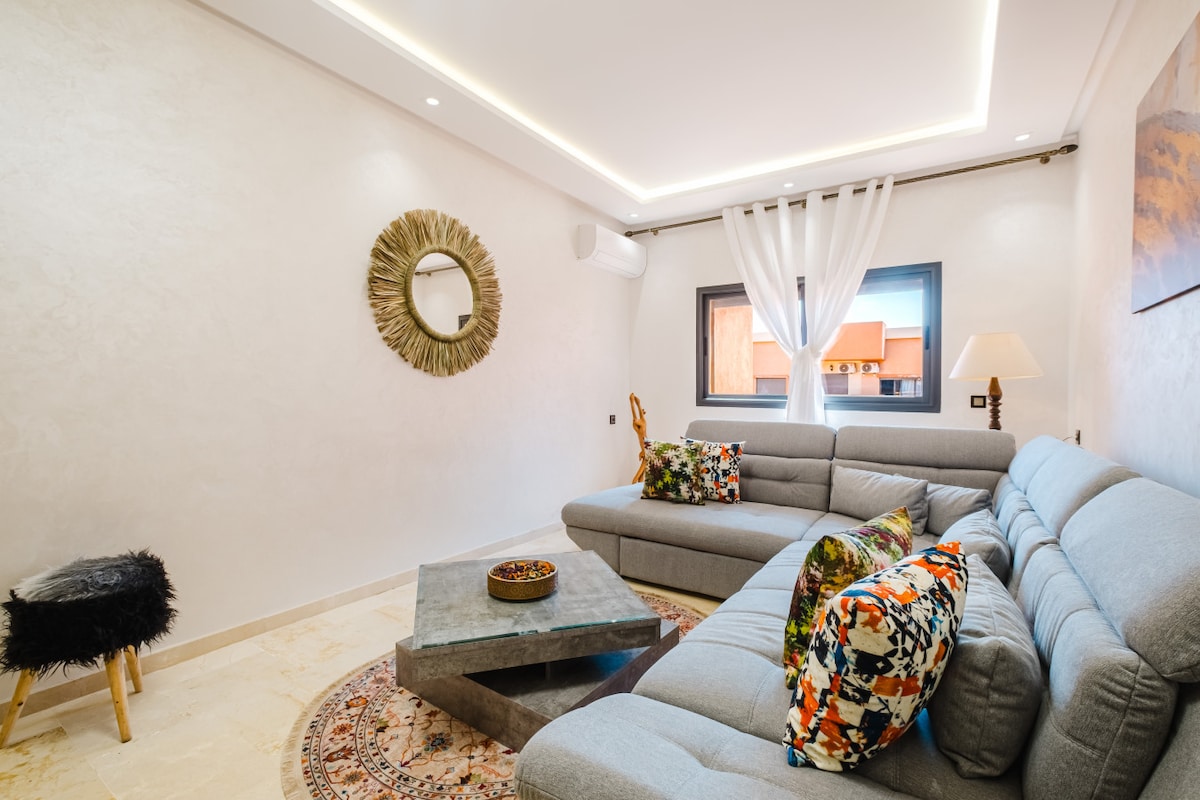 歡迎來到您在馬拉喀什的家一樣! 這間時尚的雙臥室公寓位於安全的Nour Confort住宅內,最多可容納6位房客。 享受現代舒適、寧靜和中心位置的住宿體驗,距離M大道和Gueliz市中心僅幾分鐘路程。