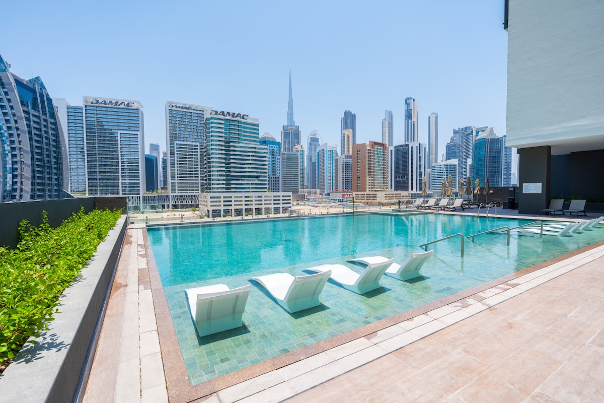 超棒的無邊泳池和水療中心 最多可容納 4 人。 加大雙人床 + 沙發床(雙人床) 飯店設施包括: 游泳池、健身房、水療中心、休息室、兒童游泳池、咖啡廳等。 這套單間公寓位於杜拜市中心的商業灣中心,可欣賞杜拜水道的壯麗景色,並可部分欣賞哈利法塔的景色。距離世界上最大的購物中心杜拜購物中心 (Dubai Mall) 也只有幾步之遙。