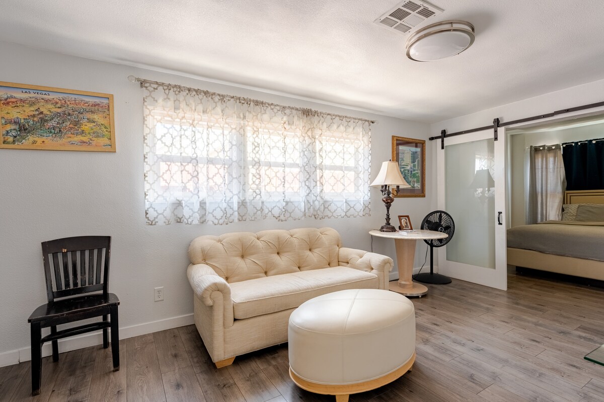 您的套房位於拉斯維加斯國家高爾夫球場,有自己的獨立入口,您可以在後院欣賞球場和大道部分的美麗景色。 距離大道、會議中心、內華達大學拉斯維加斯分校約10分鐘路程,距離藝術區/弗里蒙特僅15分鐘路程。 配備全新的小廚房、加大雙人床、獨立浴室、智慧電視(Netflix、Hulu、HBO、Disney +、Prime),甚至還有免費浴袍和拖鞋供您入住!