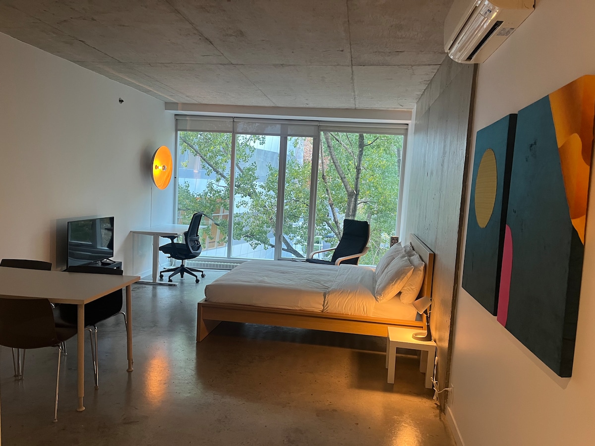 超級新單間公寓,家具齊全,位於頂樓,出租! 距離St-Laurent地鐵站、UQAM和拉丁區2步路 位於聖凱瑟琳街(St-Catherine Street)的藝術廣場(Place des Arts)和聖伊麗莎白街(St-Elizabeth Street)交叉口的村莊(the Village)之間 家具齊全:床鋪、冰箱和冷凍櫃、烤箱、洗碗機、微波爐、洗衣機和烘乾機 屋頂露台、健身房和共同工作空間