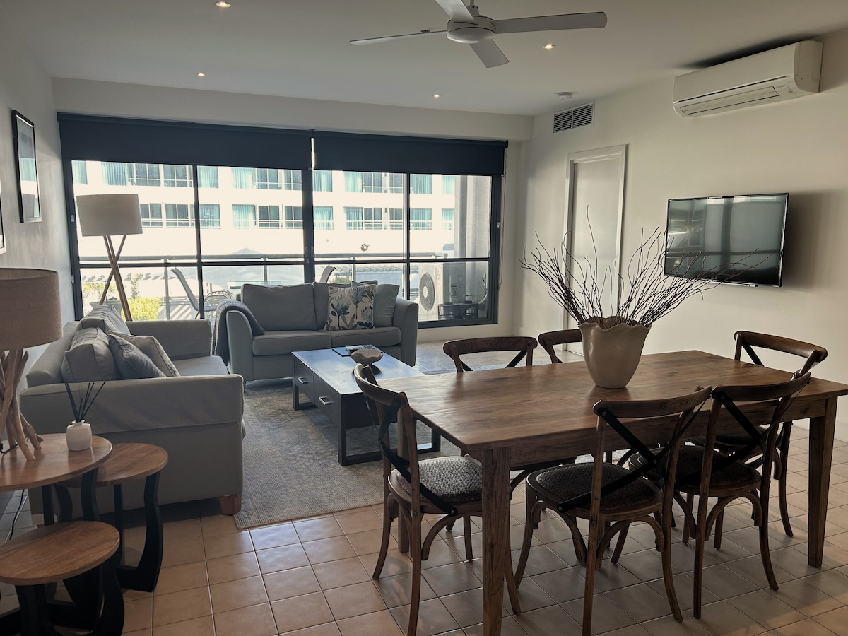 Relax in our cozy, beach-inspired two-bedroom, two-bathroom apartment just minutes from Eastern Beach, Geelong City, and Geelong Station. Enjoy calming water views from your private balcony, a basic equipped kitchen, and the convenience of your own parking space. Guests also have access to a shared gym and outdoor BBQ area. Self check-in makes arrival simple. No pets or smoking allowed. Ideal for couples, families, or business travelers seeking a comfy, coastal escape with all the essentials.