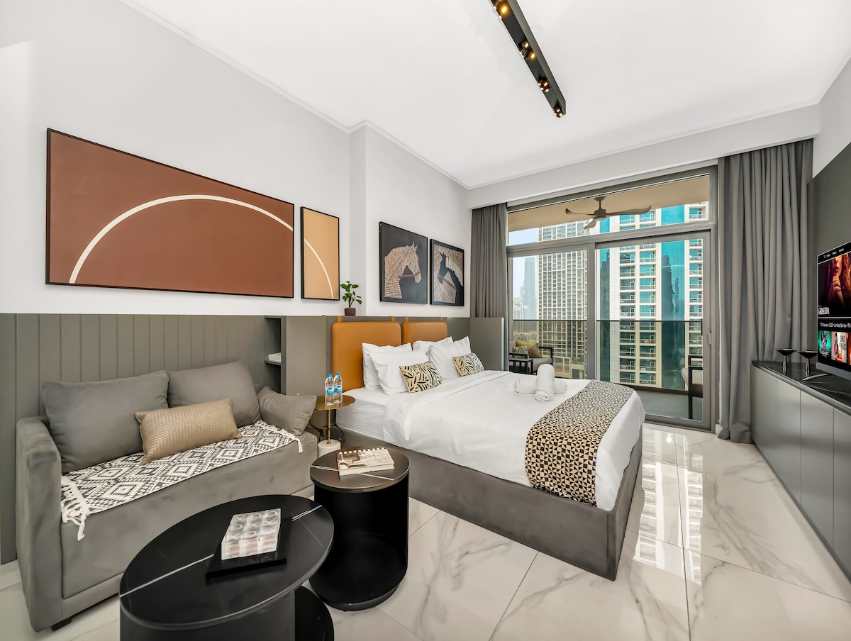 位於杜拜市中心的時尚單間公寓,從私人陽臺上可欣賞迷人的天際線景觀。 步行 7 分鐘即可抵達杜拜購物中心和標誌性的哈利法塔,距離世界一流的購物、餐飲和娛樂場所僅幾步之遙。 公寓設備齊全,配有豪華酒店風格的床單、高速WiFi、智慧電視和全套小廚房,適合商務或休閒住宿。 房客還可以免費使用大樓內的健身房和戶外無邊際泳池。