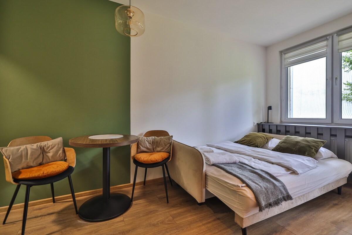 這是獨立房屋內有獨立入口的單間公寓。 這所房子位於賽馬牆上的一條非常漂亮、安靜的街道上。 一個完全獨特的地方。 公寓有入口大廳、房間、浴室、迷你廚房、衣櫃和露臺。 非常舒適的1-4人。 第三位和第四位房客以及第二位需要獨立牀位需額外支付10歐元。 對於狗,額外費用為每天20 pln。
