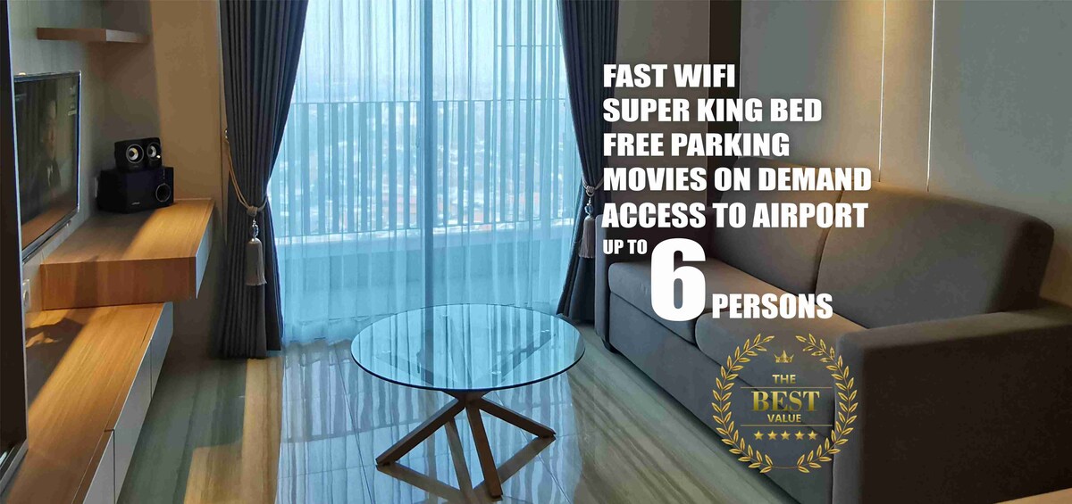 We have chic beautiful and elegant furnish designed 2 bedroom apartment in 31th floor with city view to make your stay comfort peaceful and relax. Capacity : 4 up to 6 people 2 Bedroom with Queen bed (160x200cm) Setra brand 1 Sofa bed (147x160cm) 1 Bathroom 1 Manual Washing Machine 1 Air Purifier Xiaomi With fully equipment kitchen and dining, cleaning vacuum, we want to make your relaxing day with family or relatives more delighted.. We hope you enjoy your stay with us.