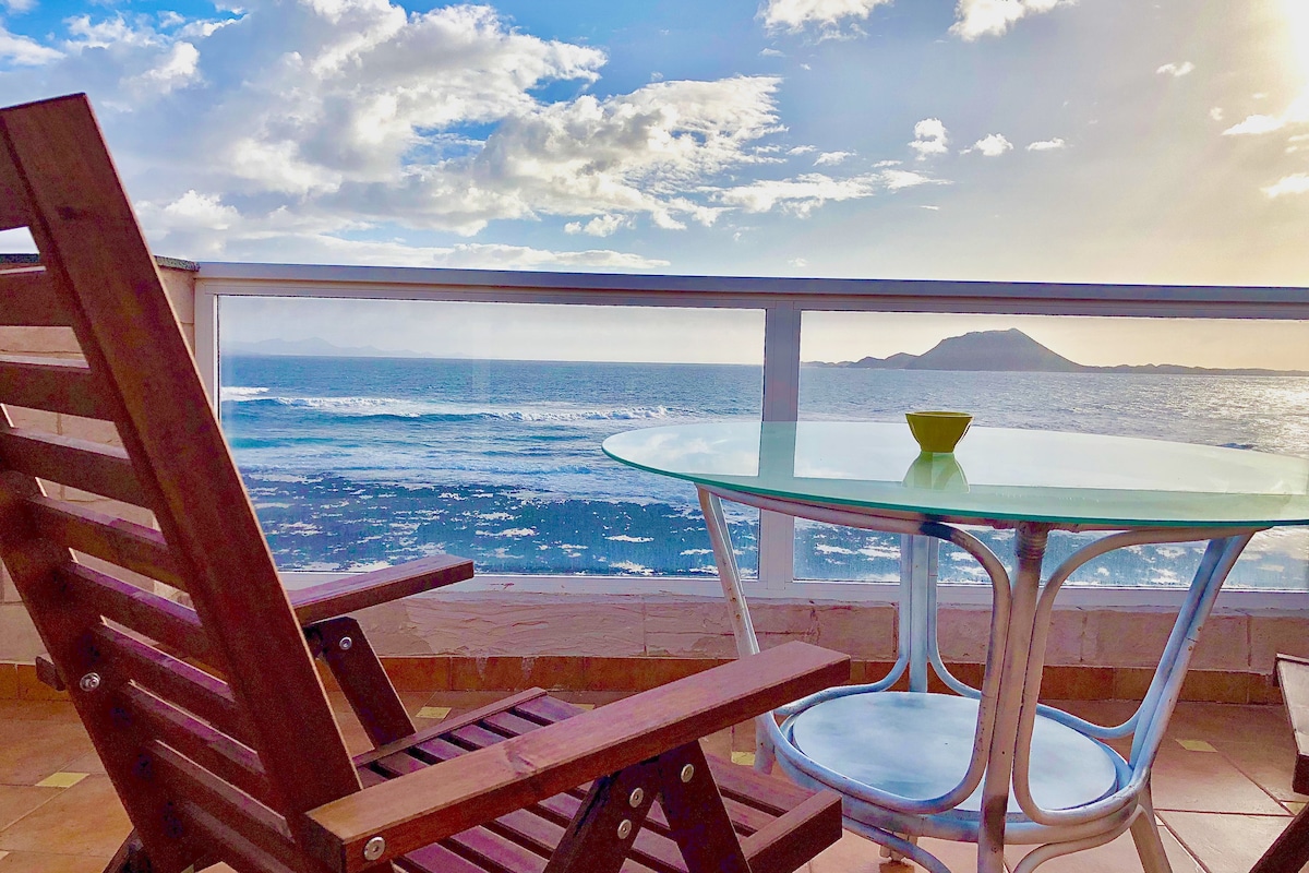Ocean Breeze El alojamiento que te hará sentir como en tu casa y en un barco flotando en el mar, gracias a sus preciosas y grandes ventanales disfrutaras cada dia de un almanecer increible con vista al mar y a las islas (lanzarote y lobos) donde, el balcon te permitirá disfrutarlo mientras estas bebiendo un café. La ubicacion es ideal, a la vez esta en una zona tranquila donde se escucha la unica melodia de las olas y a la vez esta cerca de todos los restaurantes, bares y tienda de Corralejo.