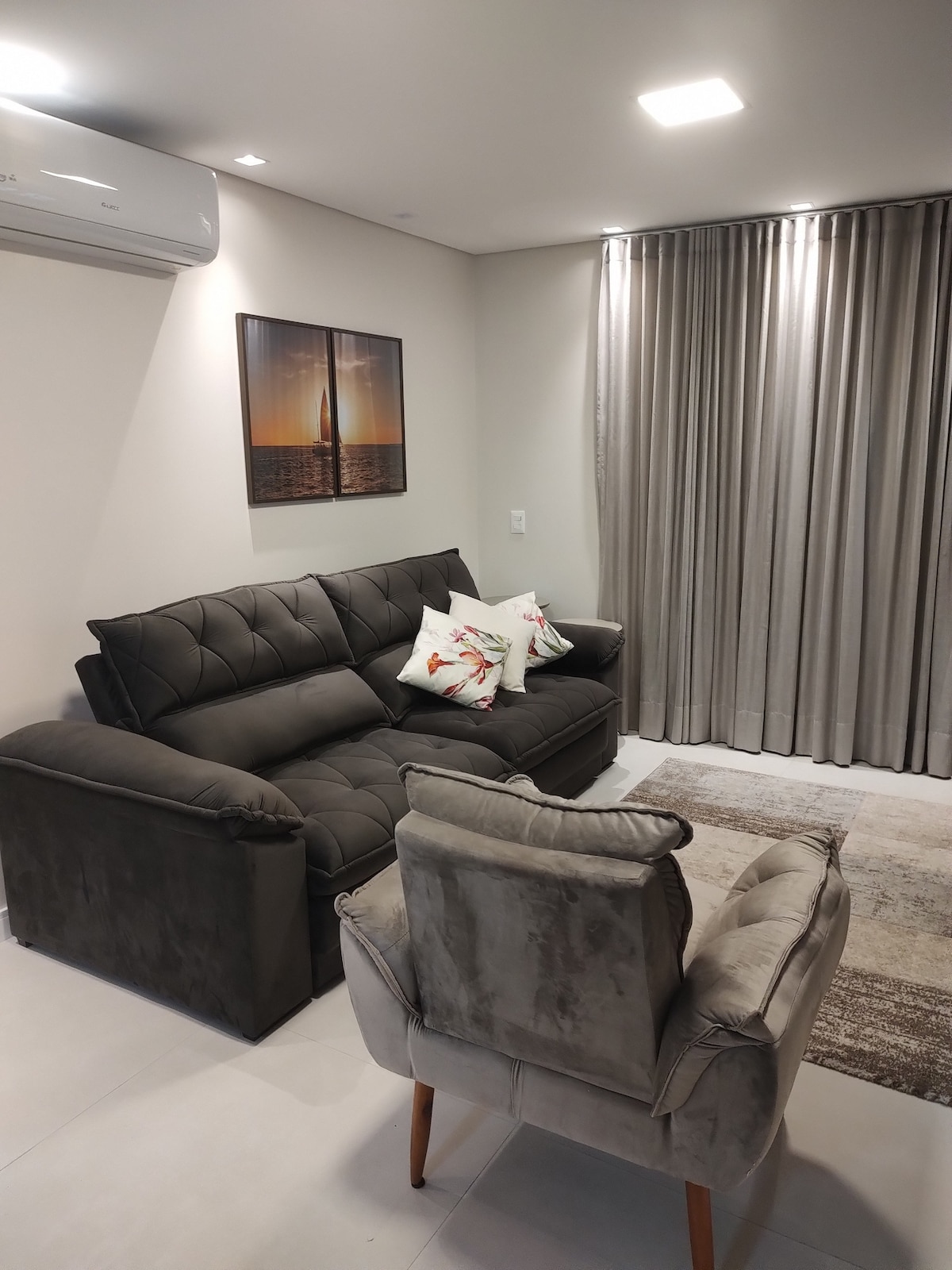 Complete apartment in the city center, close to markets, cinema, restaurants and shops. Less than 5 minutes from the sea! 😃 The apartment has a bedroom, living room, bathroom and kitchen/utility area, fully furnished and ready for use. In the living room, the apartment has a double-size sofa bed. Sea views from both the apartment and the terrace, which has a swimming pool, gym and leisure area. Also includes TV with Netflix and other streaming services (not included), barbecue and garage