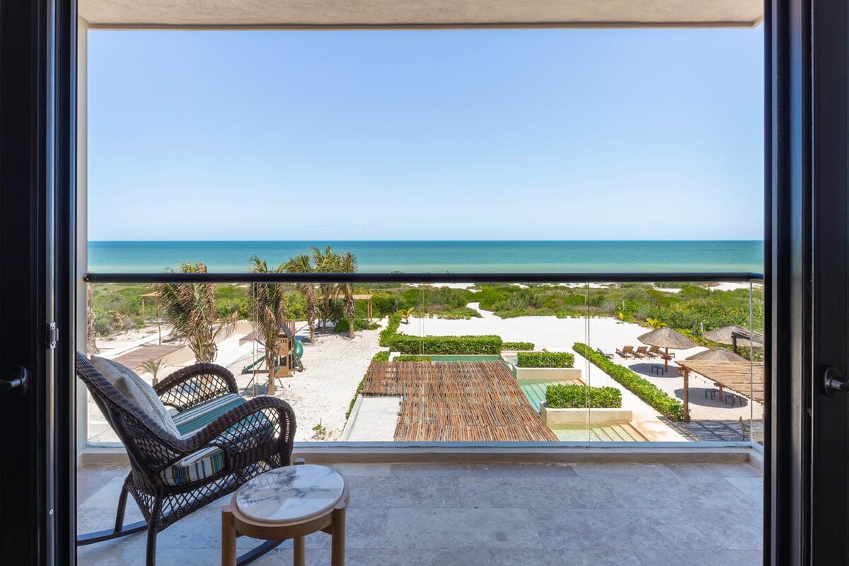 Exclusive luxury beachfront apartment with a direct ocean view from the dining room for 8 people. Fully furnished with top-quality finishes, offering spacious and comfortable living areas. Located in Turena, the newest condominium on the Yucatecan coast, within the Kinuh residential complex (Telchac Puerto).