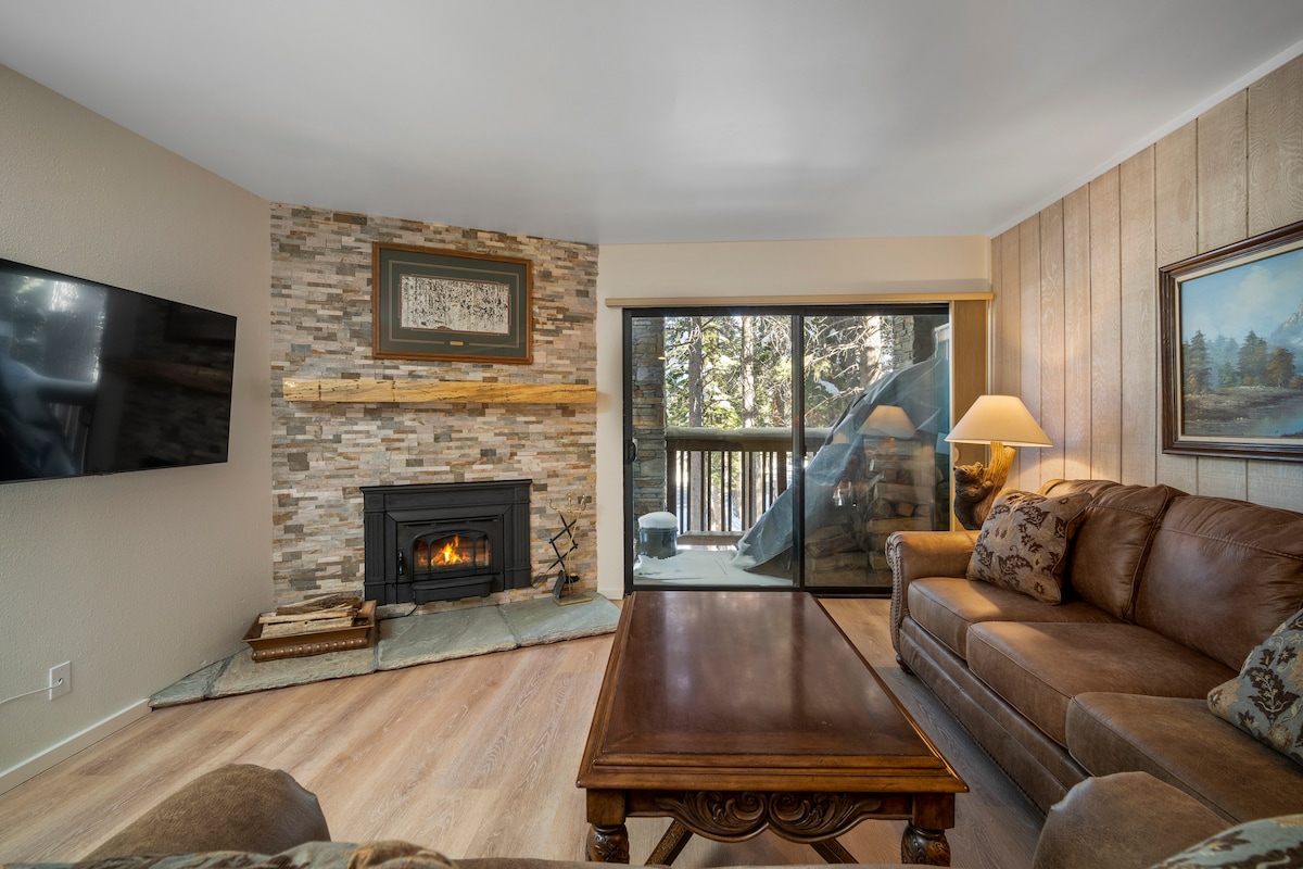 An updated ski-in ski-out condo with phenomenal views of the High Sierras. This 2 bed 2 bath condo is located at Sunstone Lodge just steps from the Eagle Express Chair lift for easy access on and off the mountain. This condo can sleep up to six guests with a king bed in the master bedroom, two twin beds in the guest bedroom, and a pull-out memory foam mattress in the living room. Cozy up next to the fireplace after a day of skiing to watch a movie on the living room's 65 inch 4K Smart TV.