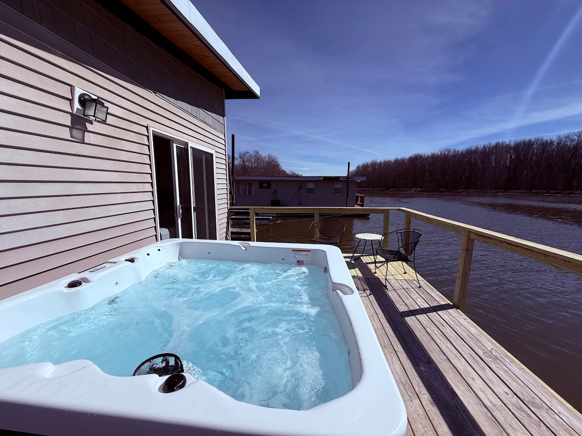 Enjoy a stay directly on the backwaters of the Mississippi River. This custom cabin is floating right on the water, and you won't find anything like it! Grab your loved one or friend and surround yourself in nature, while soaking in the hot tub on the floating patio, or in the beautiful tub inside. Relax in the king size bed thats in front of one of the two fireplaces. The cabin has everything you need, including a small kitchen. This floating oasis is located at Millennium Marina.