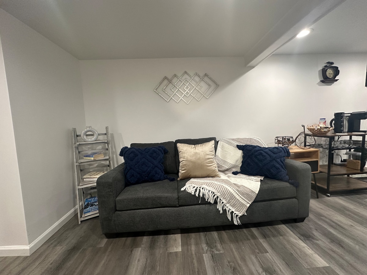 歡迎來到石屋,您的第二個家!這間裝潢精美的地下室公寓最多可供 4 位房客舒適入住,配有舒適的臥室,配有套房浴室和客廳區域的標準雙人沙發床。 享受附近的餐廳、購物和娛樂,輕鬆前往公園、公共交通和主要機場。 請注意:禁止攜帶寵物,公寓內禁止吸煙。期待在 Stone House 接待您!