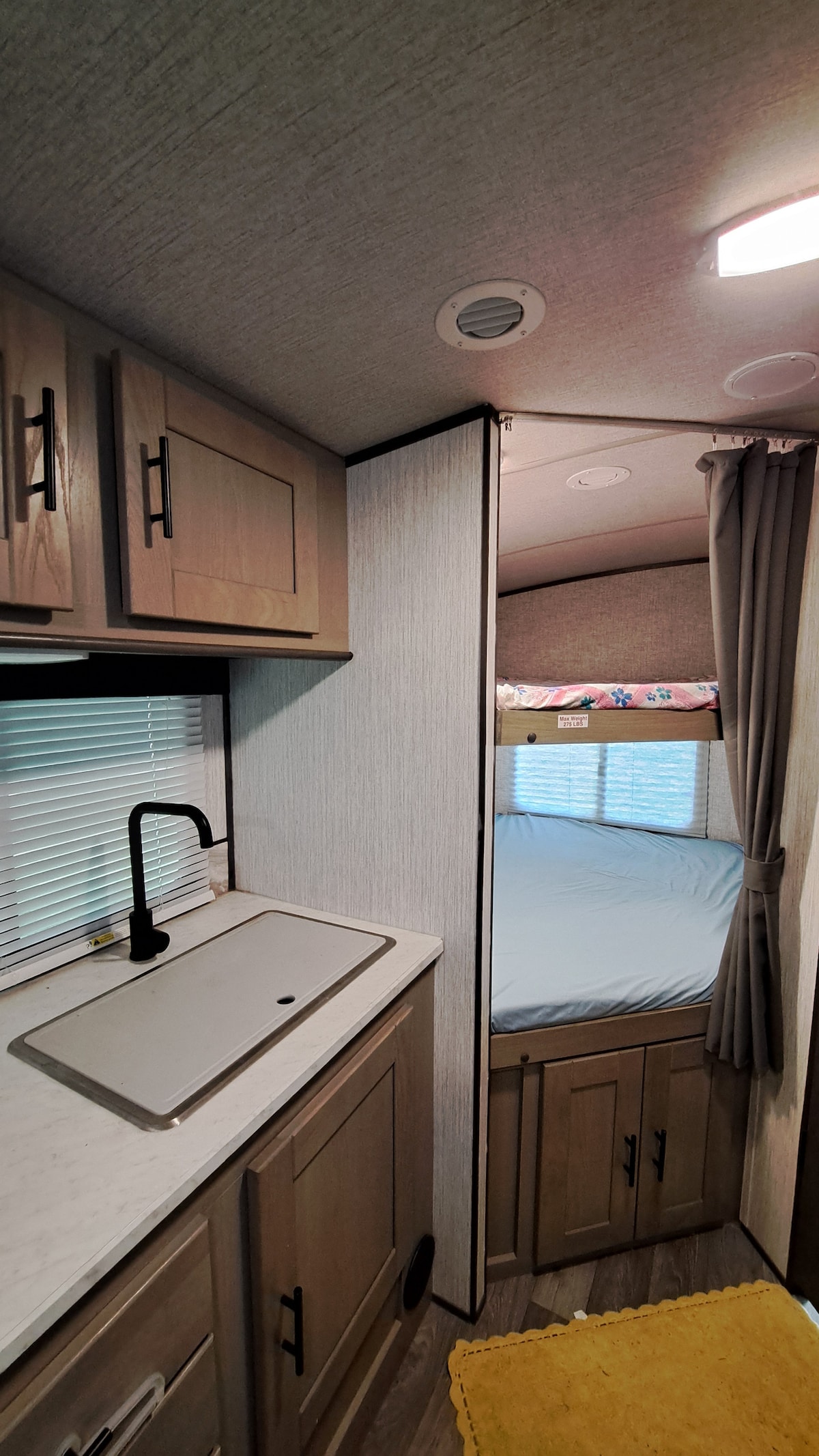 Bring your family or group to our campground with every amenity at your fingertips. The fully renovated and hooked up RV has everything you need plus access to bathroom and shower house, with laundry. Steps from the RV you have access to a small beach and dock or head down to the marina, rent a boat, go on the inflatable waterpark or just take in the summer vibes. Be as busy or chill as you wish. You are required to bring your own food, toiletries, clothing and linens ( bedding, towels).