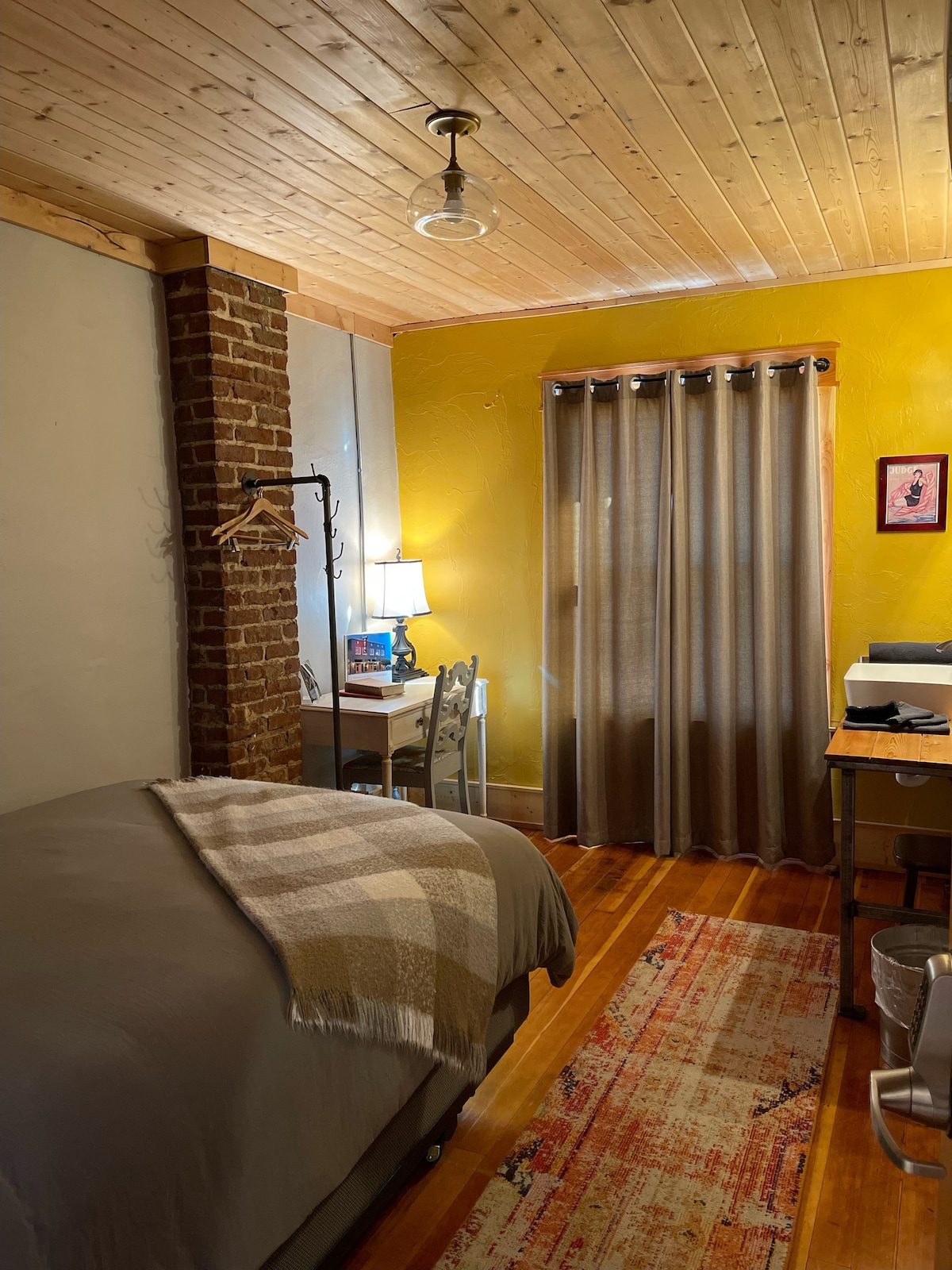 20世紀20年代的回收融合,現代/工業風格。 這是一個較小的「旅舍」風格的房間,我們喜歡稱之為我們的疲憊旅客房:)標準雙人牀,可俯瞰後院區域的景觀。 房間內有私人水槽和書桌區域,浴室就在門外。 浴室本身很漂亮,有石牆、瓷磚淋浴間以及馬桶。 鎖好門時,您可以隨時使用:)