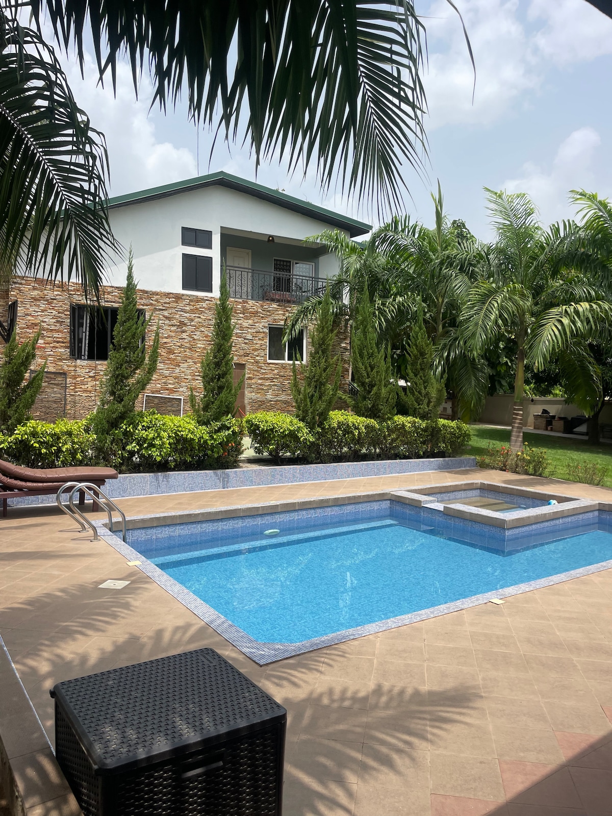 入住這個獨特且適合家庭入住的房源,讓我們留下美好的回憶。 該物業擁有寬敞的開放式地板大教堂高天花板橫樑現代牧場設計和屋頂露臺。 該物業配有高電柵欄,配有自動開門器。 每間臥室都有自己的獨立全套衛浴和客用洗手間。 從機場到別墅的所有道路(車程35分鐘) ,位於Aburi植物園,非常靠近國家消防局。