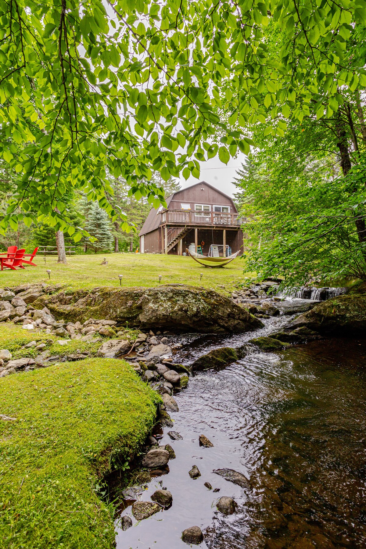 Come enjoy the ski season and a relaxing weekend at our private guest cabin in the woods. A brook flows through the backyard, providing a peaceful natural backdrop and a stone outdoor fire pit for great campfire fun. The main floor bedroom has 1 queen bed and the loft has 1 queen and 1 twin. There is also a living room couch. Just 5 min to town, 15-20min to Jay Peak! Use our vouchers for discount lift tickets! **We recently added “The Loft” listing on the other side of the same property**