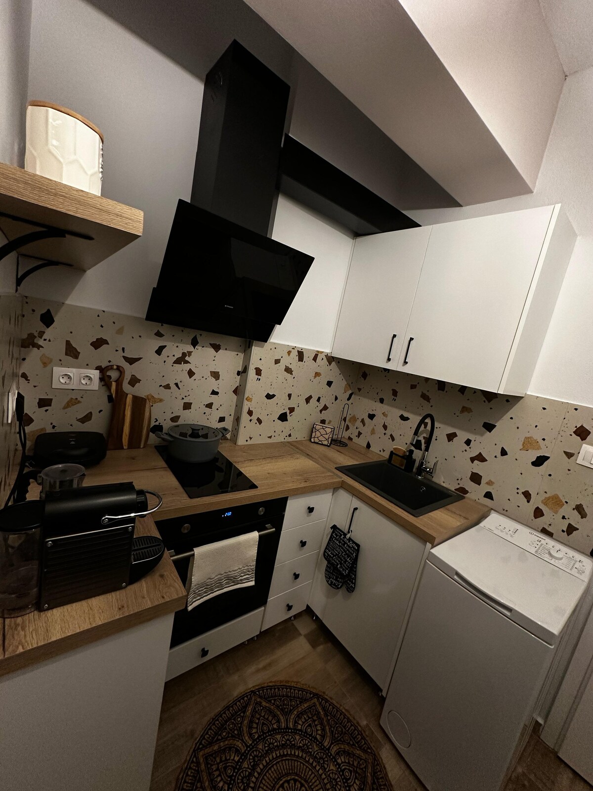 新翻修的公寓,50 平方公尺的起居空間位於一樓,正門上方。額外設施,包括設備精良的小廚房、全新改造的全新浴室、2臺電視和全功能WiFi網路。睡眠安排包括一間獨立臥室,可睡兩人,配有一張雙人床。客廳的拉出式沙發可讓額外一個人或兩個小孩舒適入住。