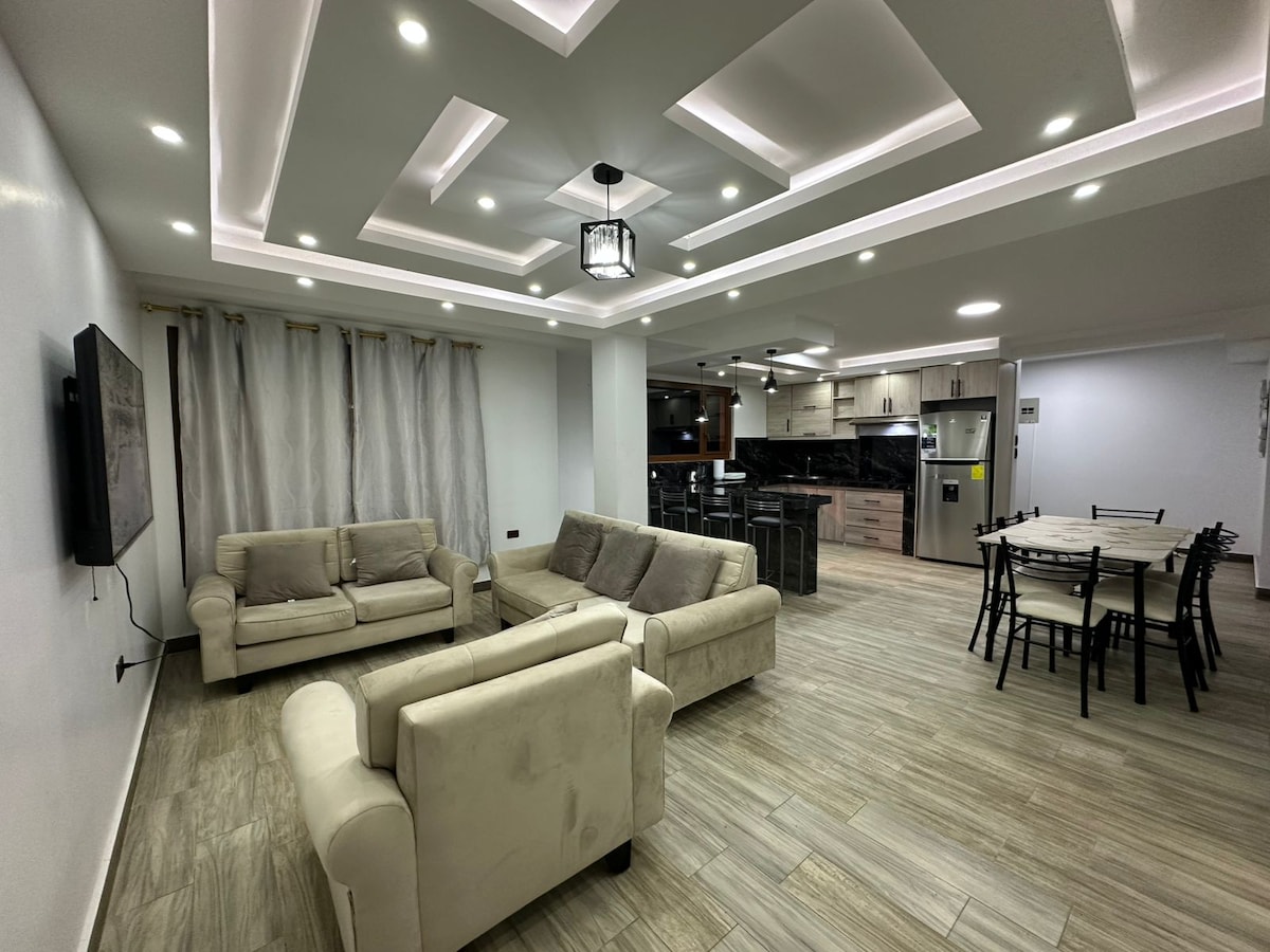 這是一間完全為接待房客而設計的套房。設備齊全,可滿足遊客的所有需求。它位於這座城市最好的建築之一。設有游泳池、桑拿房、按摩浴缸、電影室、健身房和帶燒烤的露臺。 -位置優越 -靠近購物中心和行政區 -所有設備 -非常好的城市景觀 -室外停車場 -基多獨特