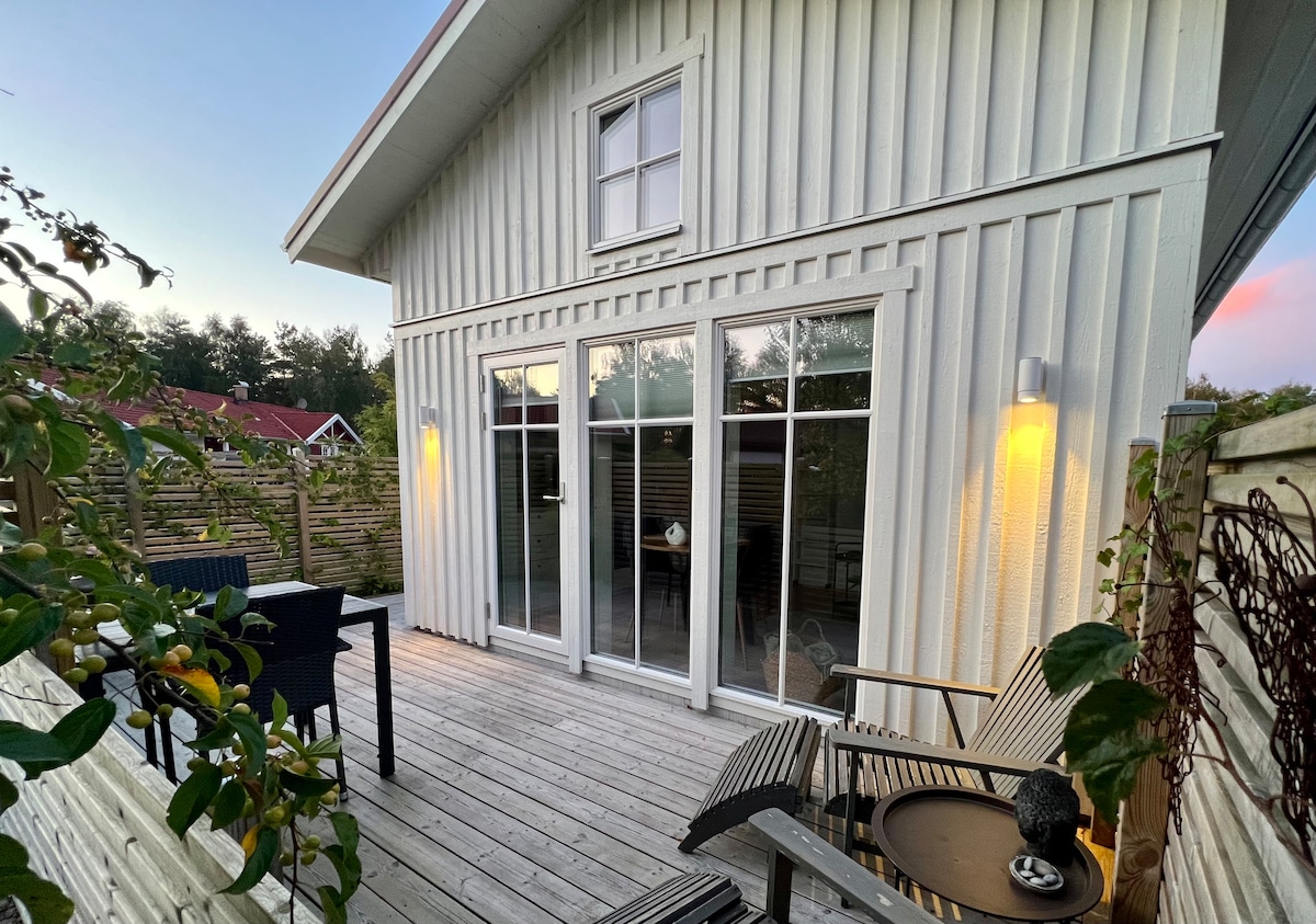 我們的舒適小屋建於2016年。它提供緊湊的住宿,並具備您可能需要的大多數功能。私人露台,配有烤架和戶外家具。私人停車位,靠近大自然。從Mellby Center的E6出發。在那裡,您可以找到Ica Maxi超市、咖啡廳、餐廳和麥當勞-所有這些都距離小屋200公尺。步行10分鐘即可抵達著名的12公里長的沙灘。附近有許多景點,開車即可抵達各種活動。