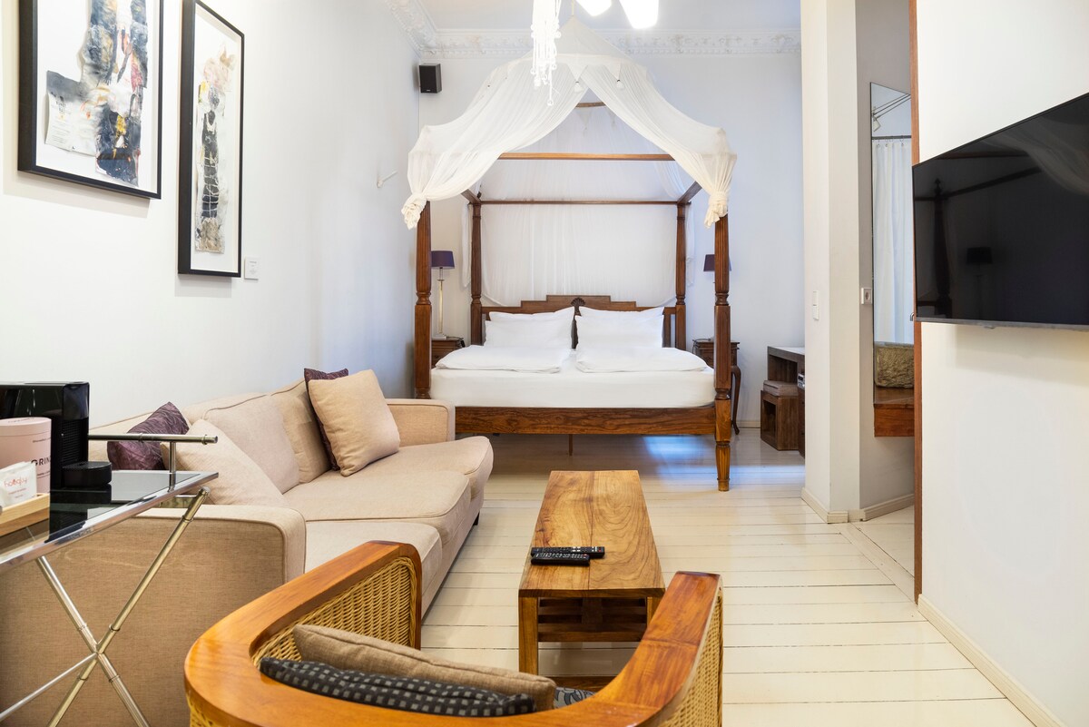 This comfortable room offers 29 sqm of space. Ideal for up to three people, its double bed (180x200), sofa, and modern bathroom with shower make this stay a perfect way to experience Berlin. There’s also a desk, sustainable coffee, a kettle, and a mini fridge, so you’ll have everything you need for maximum comfort and minimal stress.