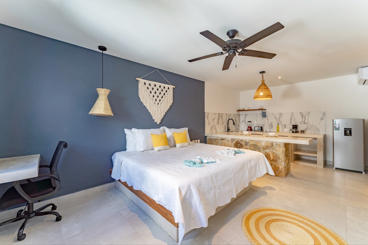 豪華1間臥室套房,提供獨特位置的隱私,旨在讓您感受天堂。地理位置無與倫比,距離海灘僅150公尺,步行2分鐘即可抵達第五大道,您可以在那裡找到餐廳、酒吧和商店。您還可以欣賞普拉亞德爾卡曼最佳的屋頂景觀,以及禮賓和24小時保安服務。