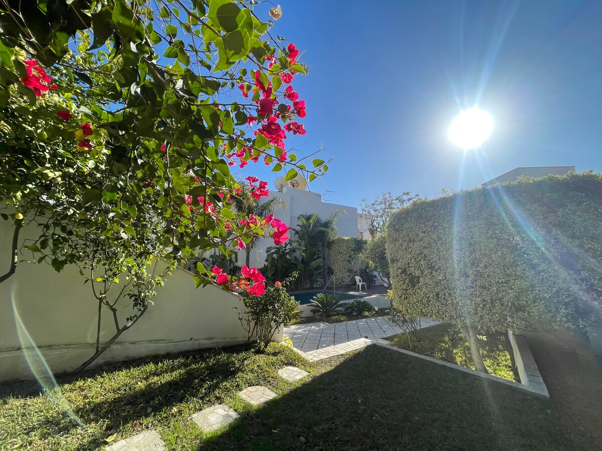歡迎來到我們迷人的單間公寓,可欣賞泳池和美麗花園的驚人景觀。 我們的單間公寓位於安靜的地區,非常適合放鬆身心。 這間獨特的住宿靠近突尼斯市中心的所有景點和所有設施,讓您輕鬆規劃旅程。 -高速網路連線 -可使用泳池和鬱鬱蔥蔥的花園 - 4K QLED電視 -洗衣房(洗衣機)