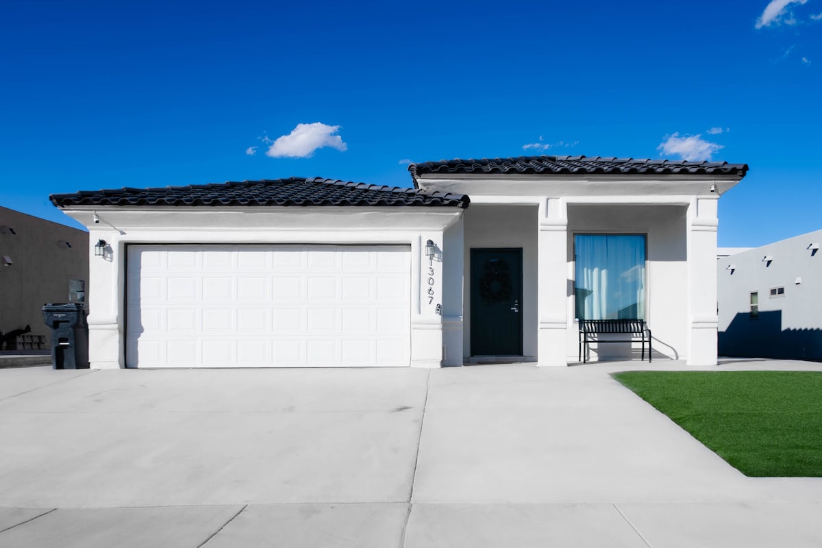 美麗的全新現代化房源。距離餐廳和娛區僅幾分鐘路程的閃亮加熱海水泳池和水療中心。在這片沙漠綠洲享受厄爾巴索的陽光!房子可舒適入住6人。華麗的全套廚師廚房、美麗的主臥室,配有巨大的步入式淋浴間和噴射按摩浴缸,距離I-10 5分鐘路程,距離Cielo Vista/The Fountains 11分鐘路程,距離市中心18分鐘路程,距離Ft. Bliss 10分鐘路程。 **如果您在預訂時遇到問題,請傳送訊息給我們**