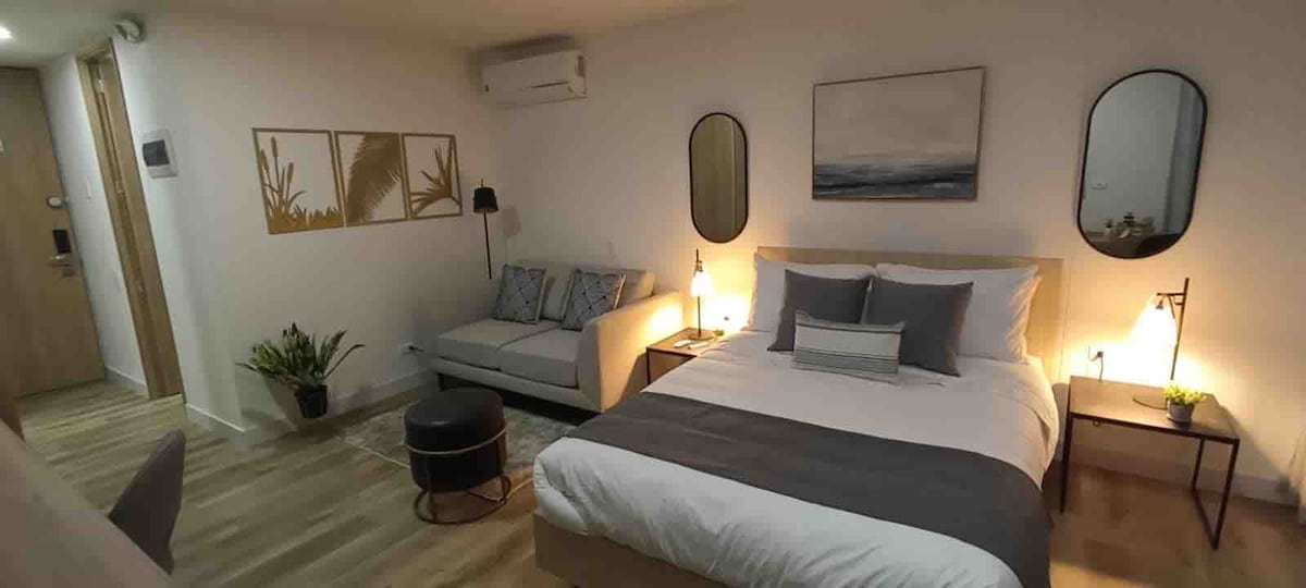 非常舒適的公寓,配有浴室、一間配有加大雙人床的房間、廚房、配有 300 M 網路的工作空間、43 吋智慧電視、2 間浴室、更衣室、床墊或額外人員的沙發床。 您將位於距離地鐵 3 個街區的恩維加多 (Envigado),這是一個安靜的街區,代表了麥德林的傳統,每個角落都有咖啡廳和商店,以及運動區域。