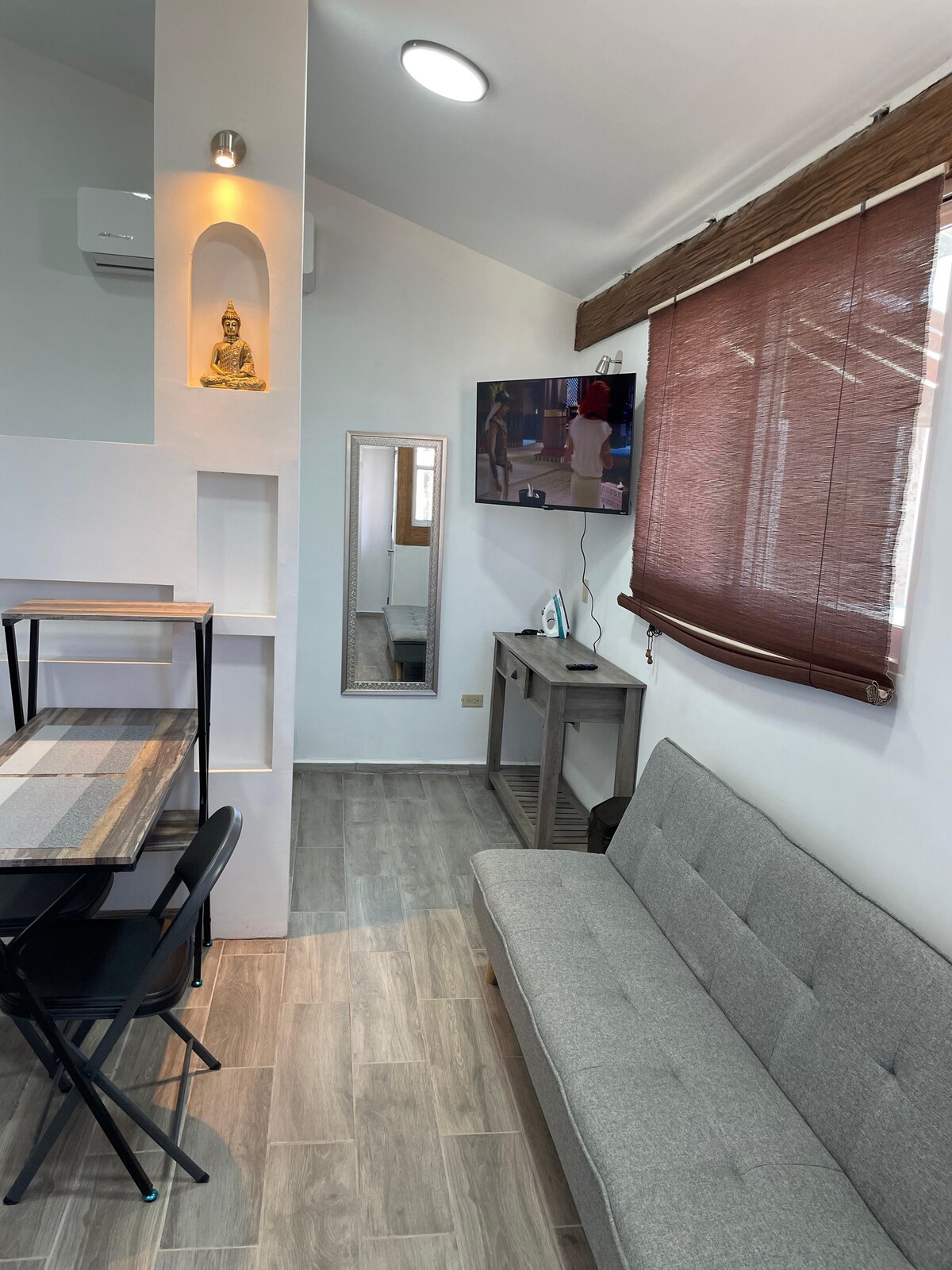 Disfruta de un departamento estudio acogedor y completamente nuevo, diseñado para ofrecerte comodidad y practicidad durante tu estancia. Perfecto para dos personas, con opción de hospedar a una tercera en un sofá cama. A solo 10 minutos de supermercados y de la playa, para que disfrutes lo mejor de la región. Estaremos felices de ayudarte a que tu experiencia sea inolvidable, podemos hacerte recomendaciones o apoyarte con equipamiento de playa para que aproveches al máximo tu estancia.