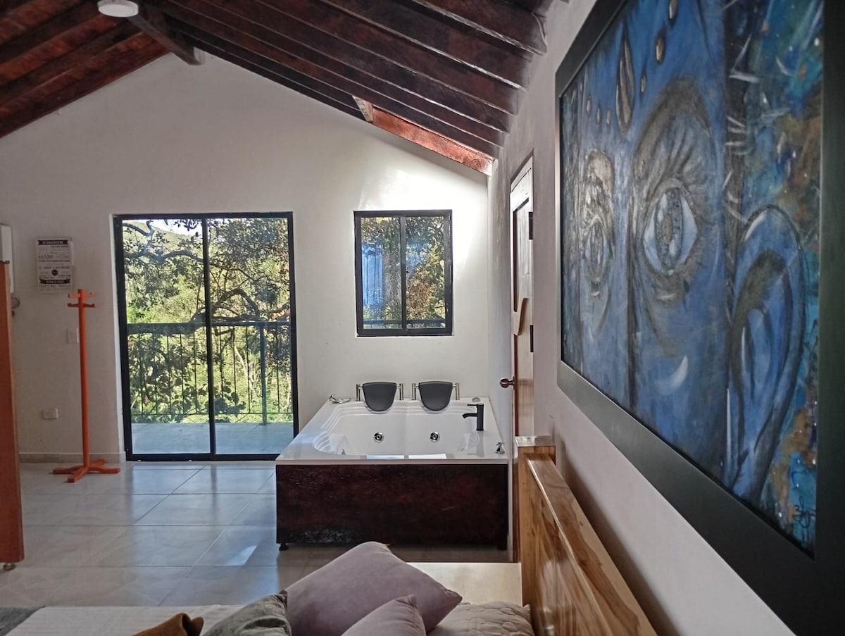 ¡Bienvenidos a Santuario Natural, un refugio de paz y naturaleza! Nuestra acogedora cabaña está rodeada de vegetación y ofrece vistas impresionantes del entorno natural. - 2 habitaciones cómodas con vistas espectaculares. - Jacuzzi burbujas. - Sala con muebles, televisión. - Wi-Fi - Deck - Malla Catamarán -Zona BBQ - Cocina con todo lo necesario para una estancia agradable -A 15min de Santuario Ant(5km) y a 1 hora y media de Medellín ¡Reserva ahora y disfruta de una experiencia inolvidable!