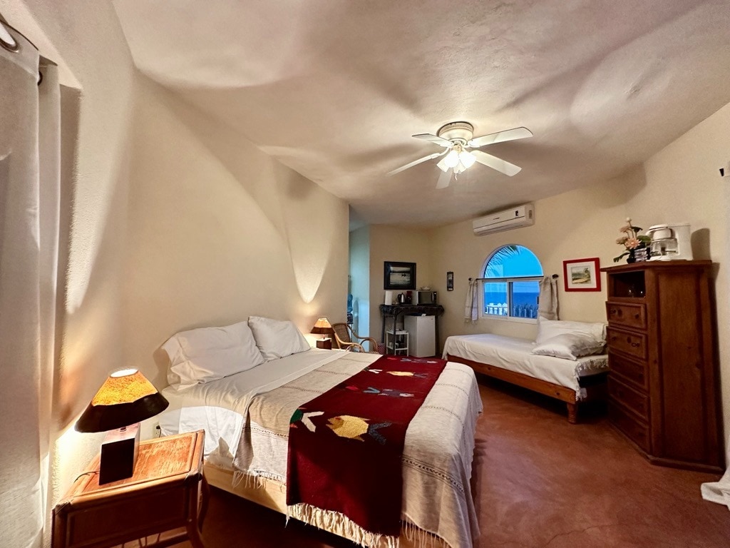 Palo Blanco es una habitación privada, luminosa y tranquila, ideal para descansar frente al mar. Cuenta con cama queen size, baño privado, aire acondicionado, frigobar, microondas y una barrita desayunador para mayor comodidad. Lo mejor: su gran ventanal con vista directa a la Isla Cerralvo y al mar. Perfecta para parejas o viajeros que buscan un espacio cómodo, fresco y con buena energía, a solo unos pasos de la playa.