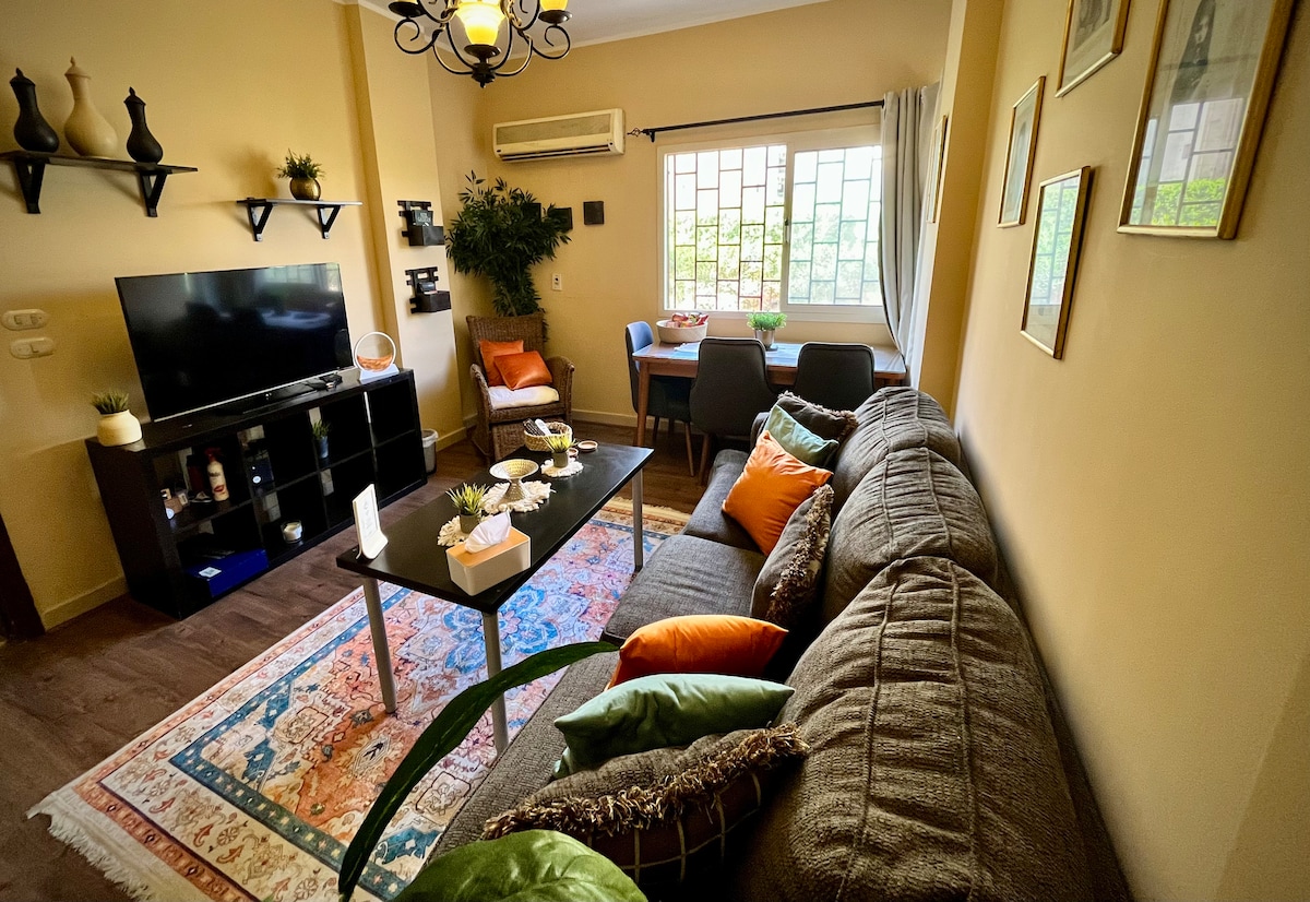 Enjoy a stylish stay in this cozy, high-quality, centrally located 2BR apartment in the best area of Giza — Sheikh Zayed. Located on the first floor with a view of the main street and lush trees, right across from Gate Plaza Mall — home to supermarkets, coffe shops, and restaurants. Easy Uber/taxi access and app-based deliveries make your stay seamless. Fast Wi-Fi, comfy beds, and all essentials included. Your perfect Cairo stay starts here!