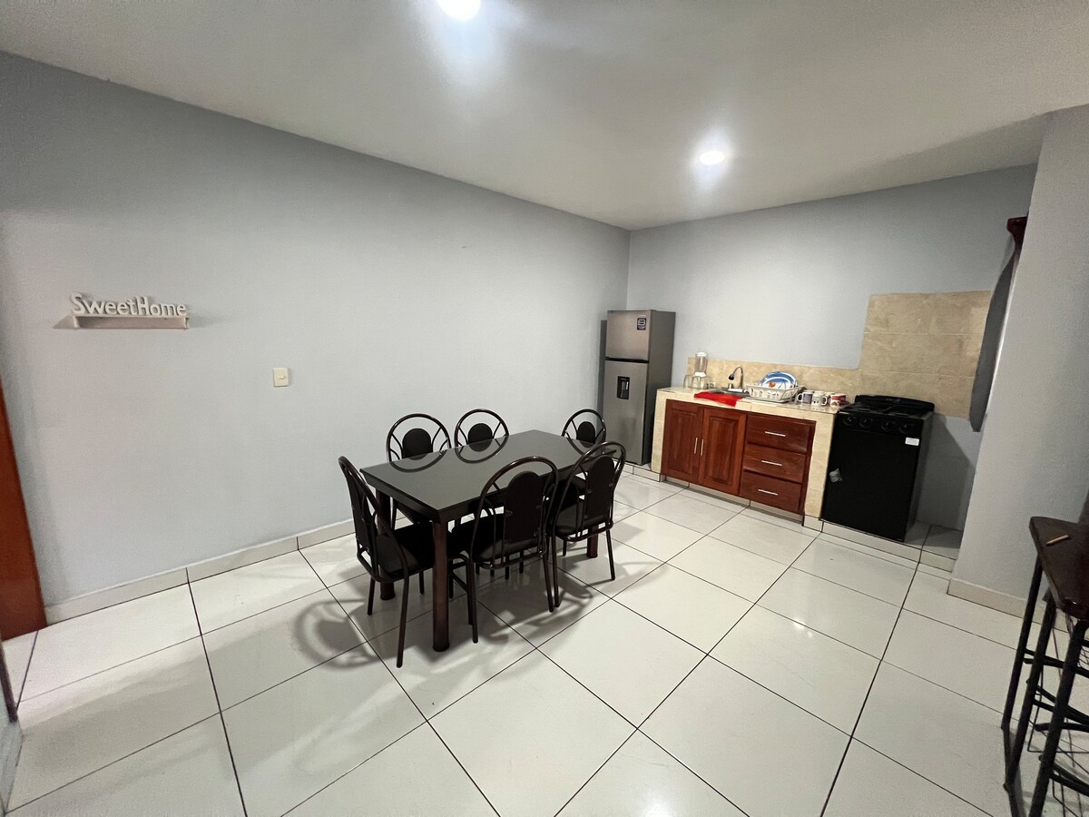 Relájate en este espacio tan tranquilo, elegante y espacioso. Lugar cómodo ideal ya sea para parejas, individual o familias pequeñas. Contamos con WiFi simétrico de 80Mps. Te sentirás como en casa y para cuando salgas con tu mejor outfit, tómate una foto en nuestro excelente spot para fotografías. Espacio con cochera para un vehículo pequeño o mediano. El departamento es en la planta baja, cuenta con su entrada propia independiente. A 13min caminando de la plaza o 5min en vehículo.