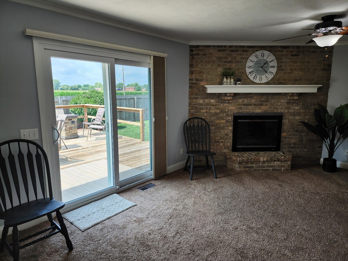 祝您在The Petersburg Place住宿愉快,這是一個舒適的2間臥室、1間浴室房源,坐落在伊利諾州彼得斯堡市中心附近的山坡上!房源只需三步即可進入單層房屋、無鑰匙入口、有足夠的空間停放幾輛車或一艘船、有圍欄的後院、配有烹飪必需品的全功能廚房、55英寸電視(Amazon Firestick)和Wi-Fi。