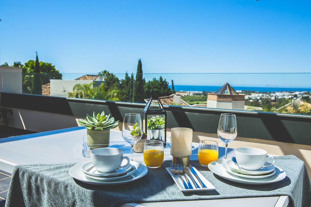 從私人屋頂醒來,欣賞藍天和令人驚嘆的海景🌊。 享受金色日落、一杯葡萄酒或在私人空間日光浴。 Pueblo Paraiso的這間明亮公寓距離馬貝拉的海灘、高爾夫球場和舊城區僅12分鐘路程。 快速WiFi、舒適的床鋪、設備齊全的廚房、無邊際泳池和屋頂,可觀星或日落晚餐。 非常適合情侶、家庭或遠距工作。 適合兒童入住,附近有遊樂場